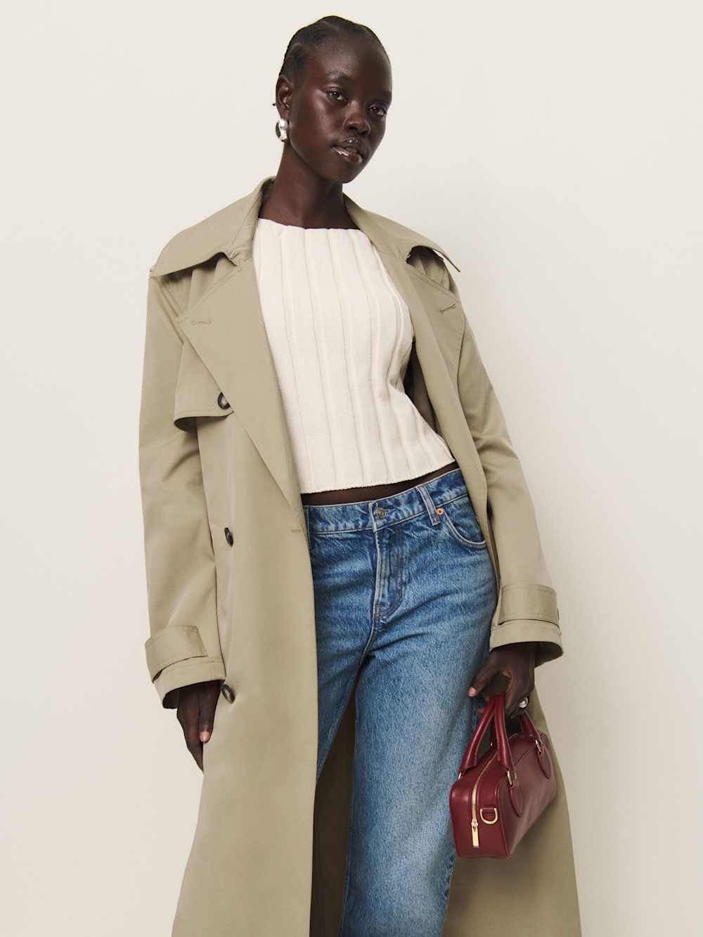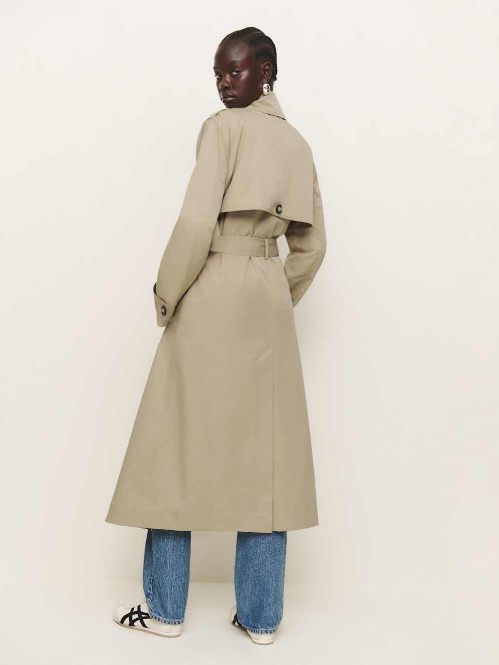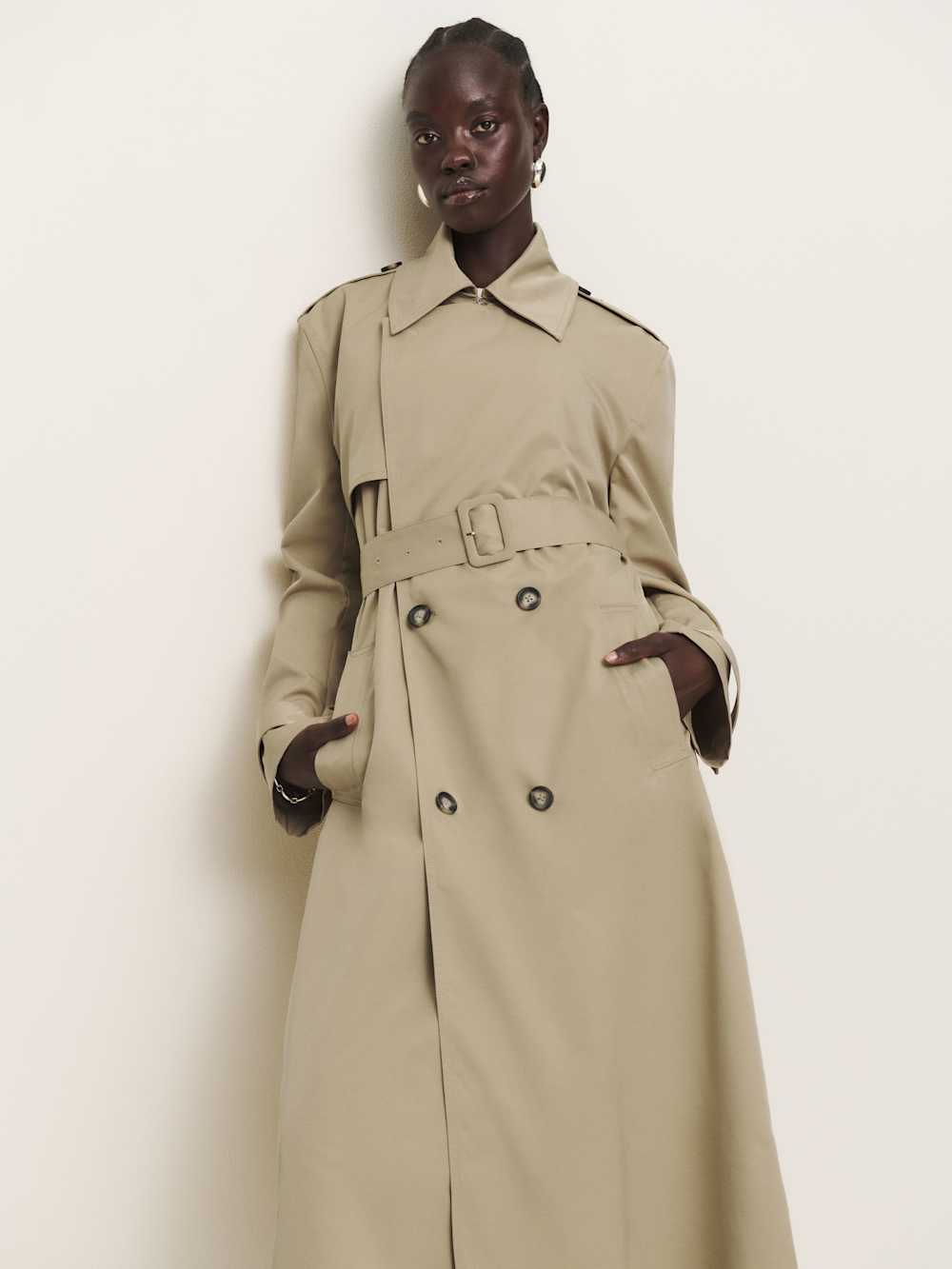 Cozy up. Shop the Petites Matteo Trench from Reformation, a double-breasted, full-length trench coat with a detachable belt.