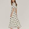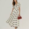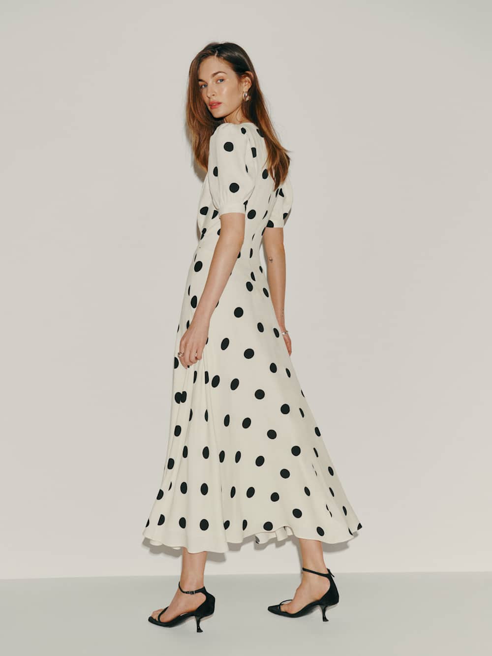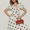 How classic. Shop the Petites Naira Dress from Reformation, a full-length dress with a V-neckline, puffed sleeves, and ruching at the bust.