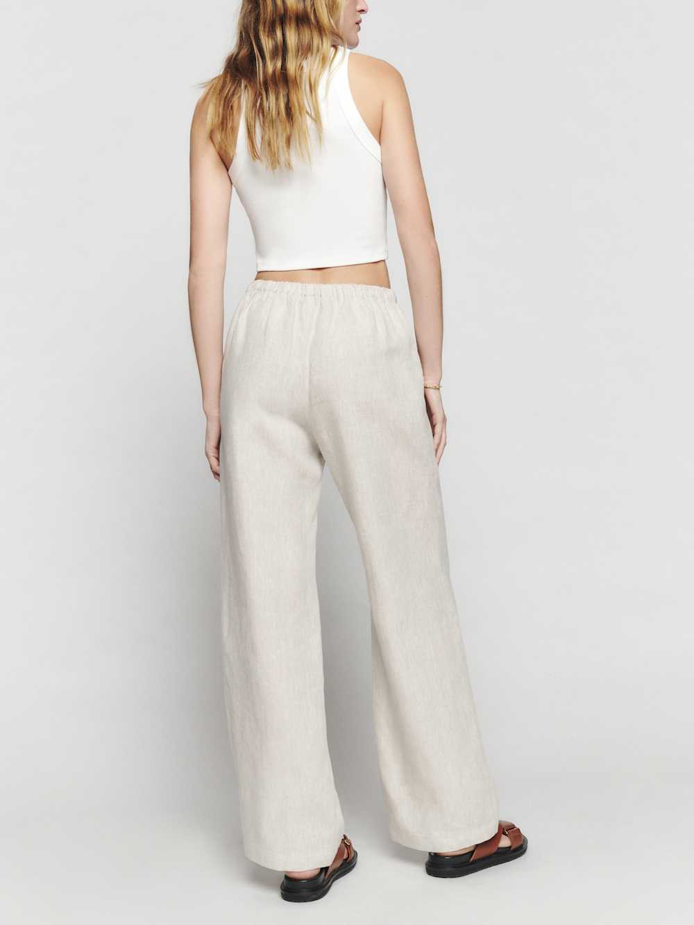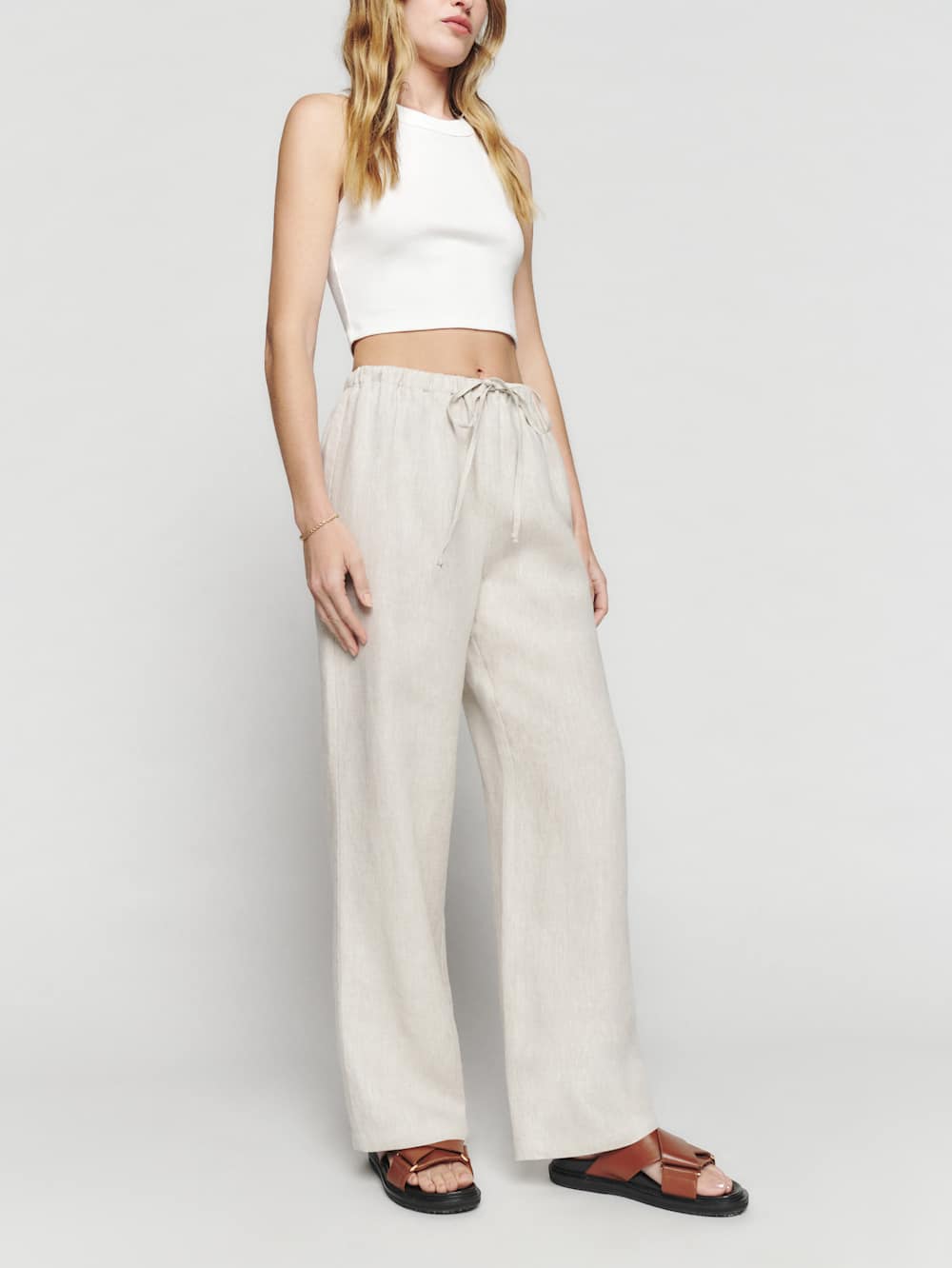 Wear the pants. Shop the Petites Olina Linen Pant from Reformation, a relaxed fitting pant with a fitted and drawstring waist.