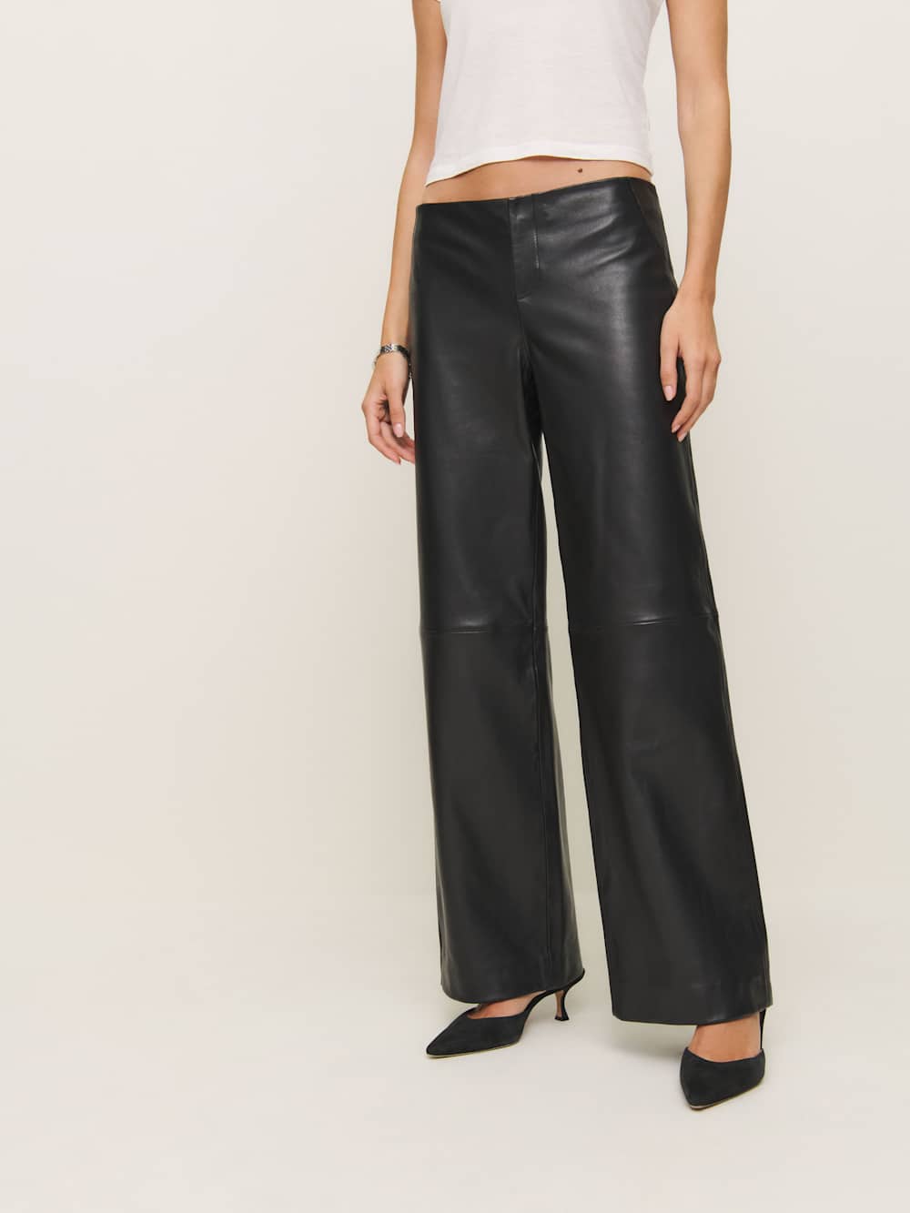Who, me? Shop the Petites Veda Vida Low Rise Leather Pant from Reformation, a low-rise leather pant with a relaxed leg.