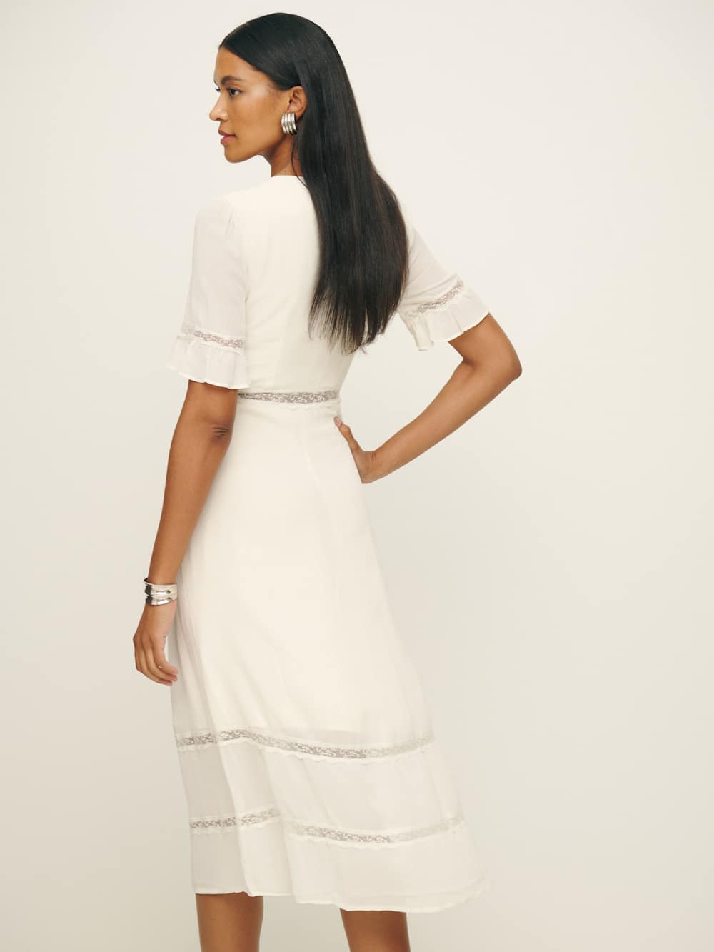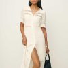 How dreamy. Shop the Petites Woodson Dress from Reformation, a short sleeve midi dress with a slim fit.