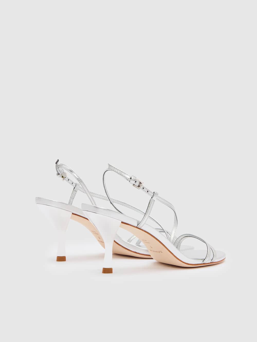 Wear me. Shop the Petunia Heeled Sandal from Reformation, a heeled sandal with asymmetrical straps at the upper and a strap at the ankle.