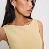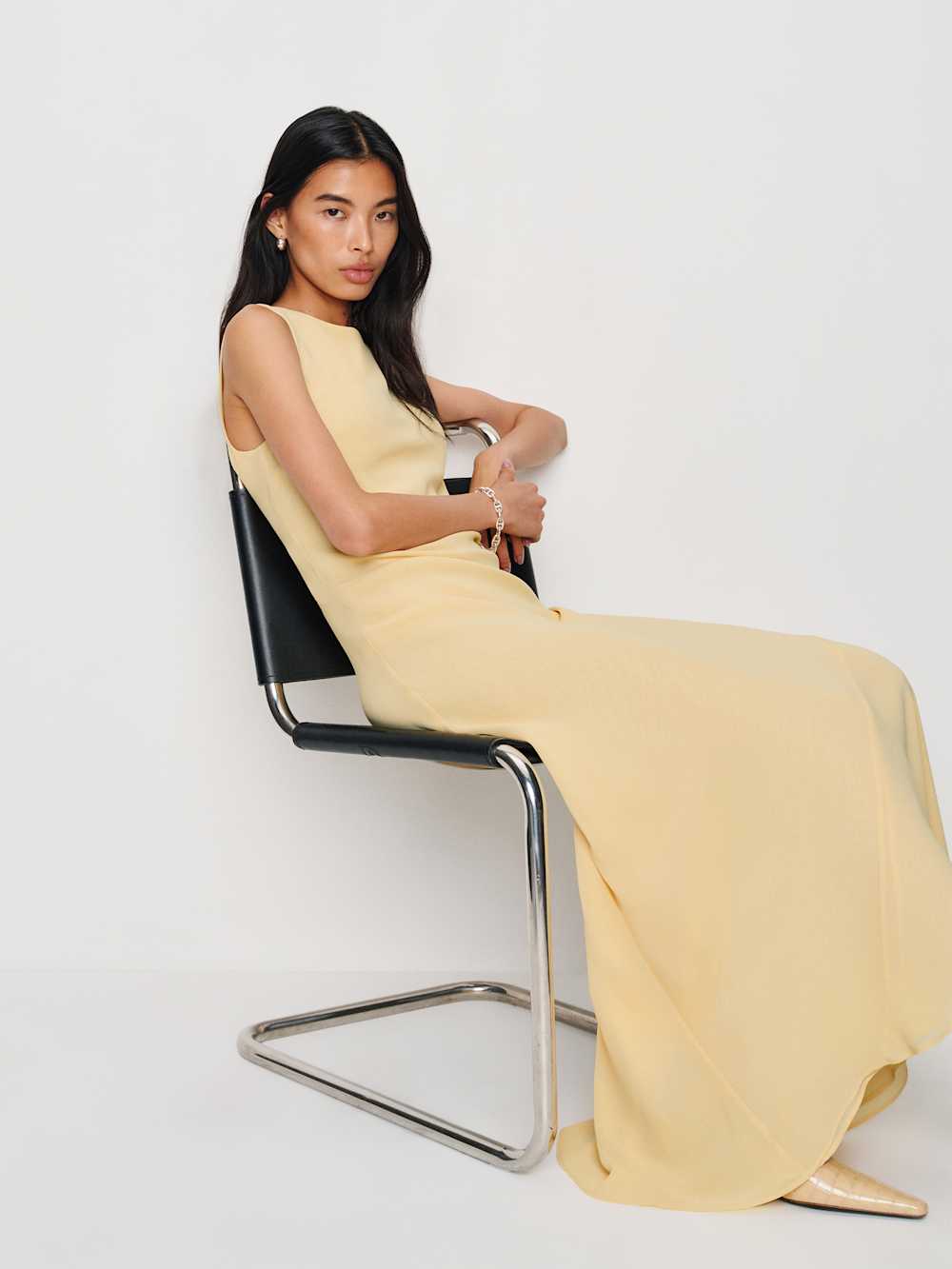 What do we have here? Shop the Prescott Dress from Reformation, a sleeveless maxi dress with a high neckline and a bias stitching detail.