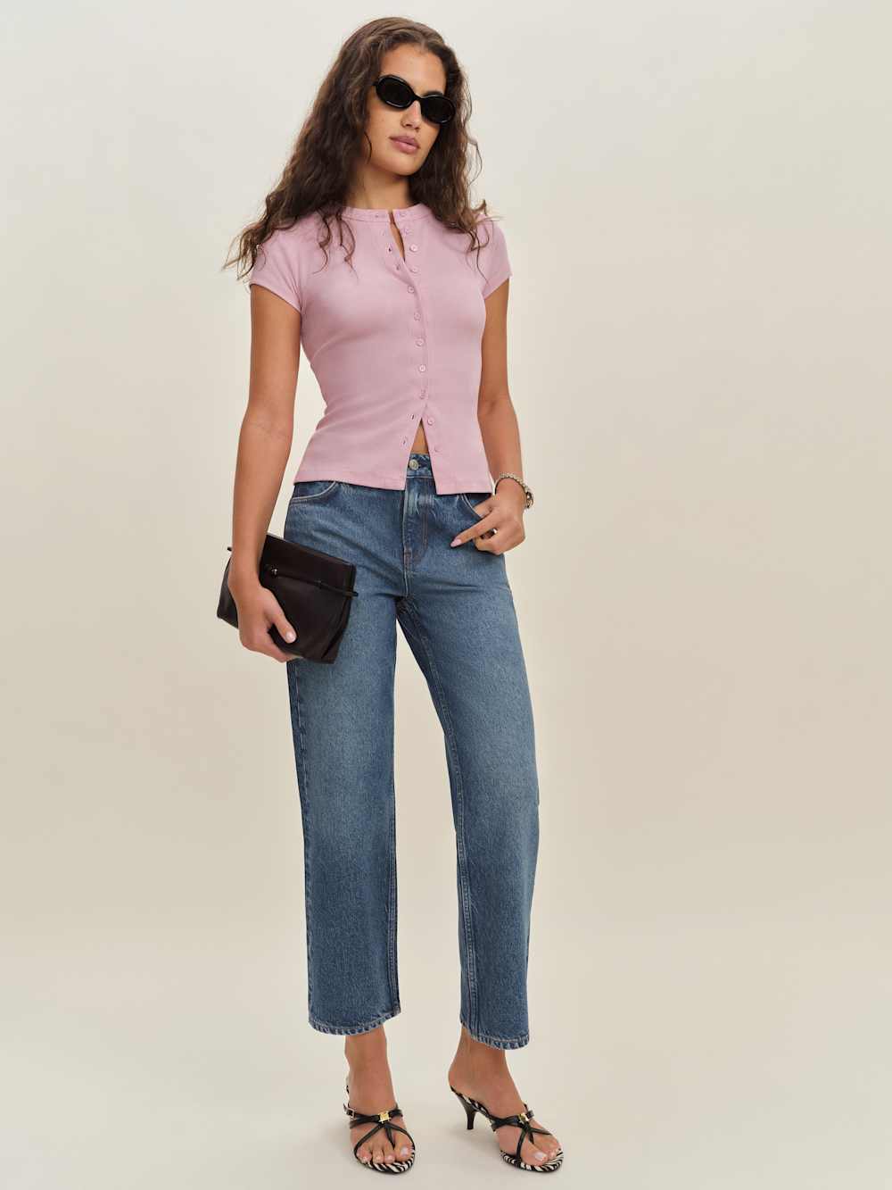 Easy little knit. Shop the Raelynn Knit Top from Reformation, a short sleeve top with a button front.