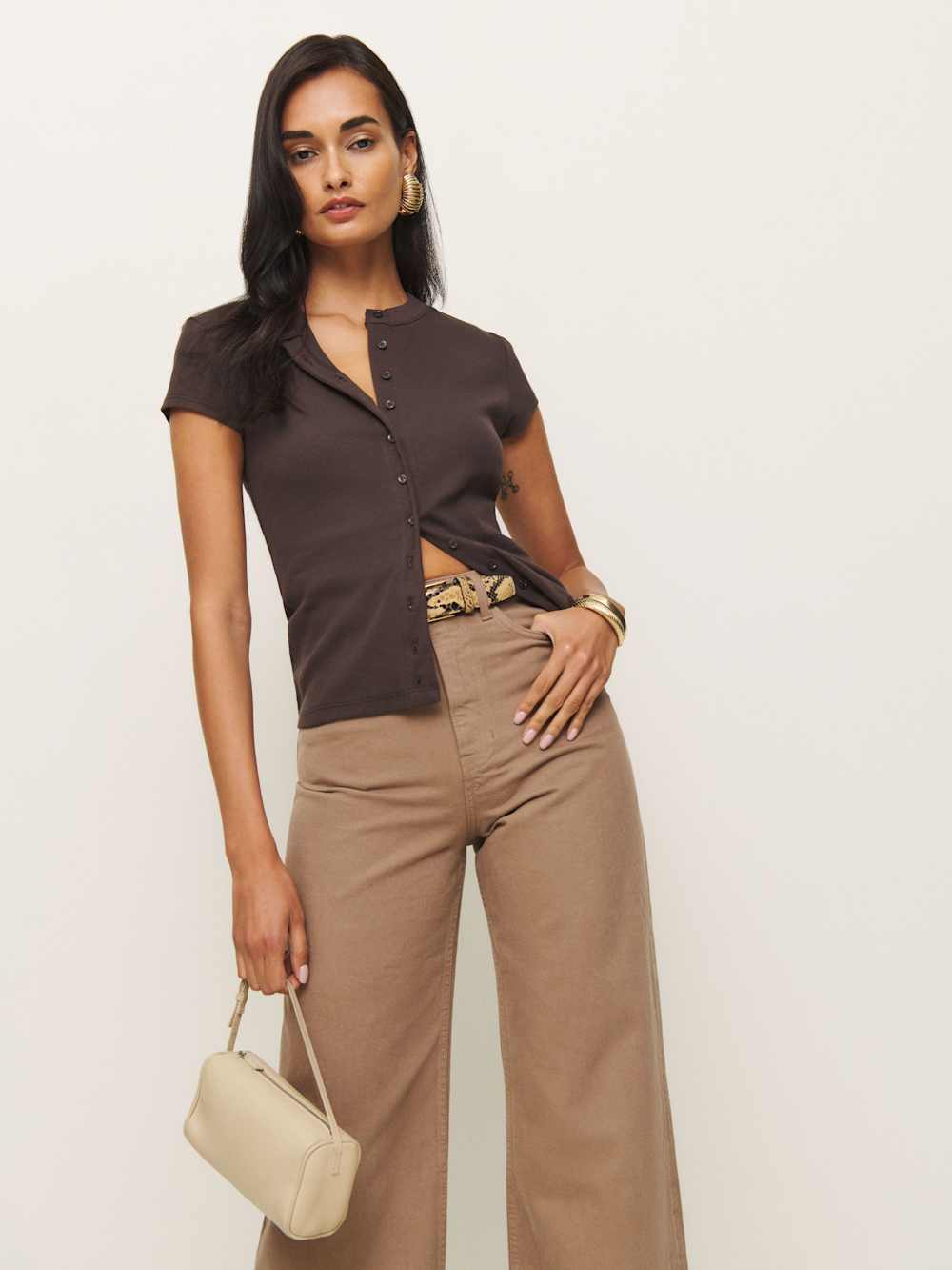 Easy little knit. Shop the Raelynn Knit Top from Reformation, a short sleeve top with a button front.