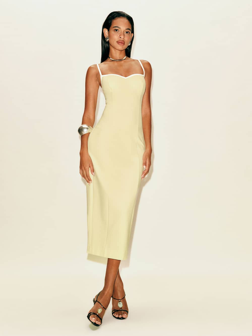 Wear the dress. Shop the Remi Knit Dress from Reformation, a sleeveless midi dress with a sweetheart neckline and seam detailing.