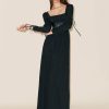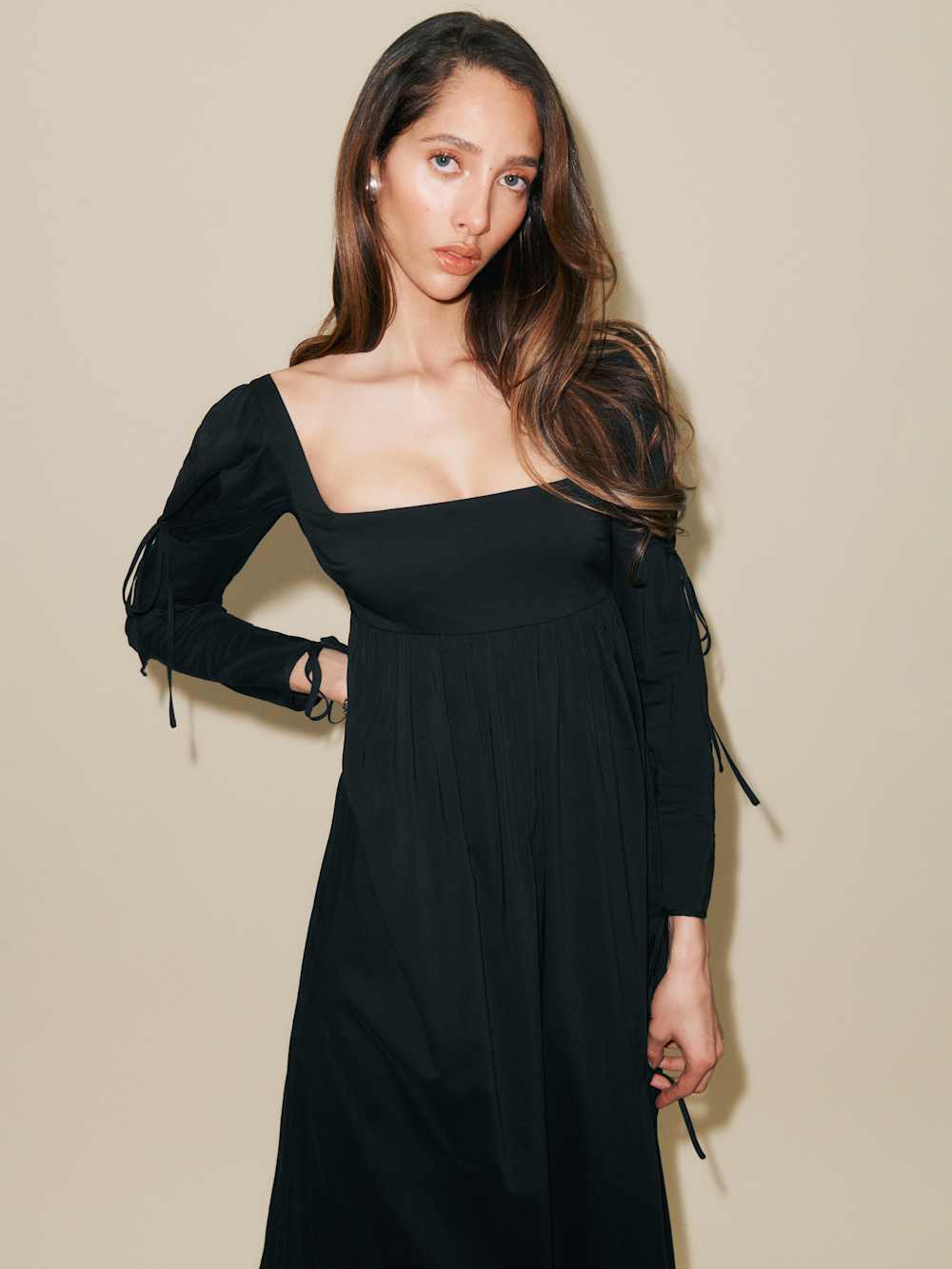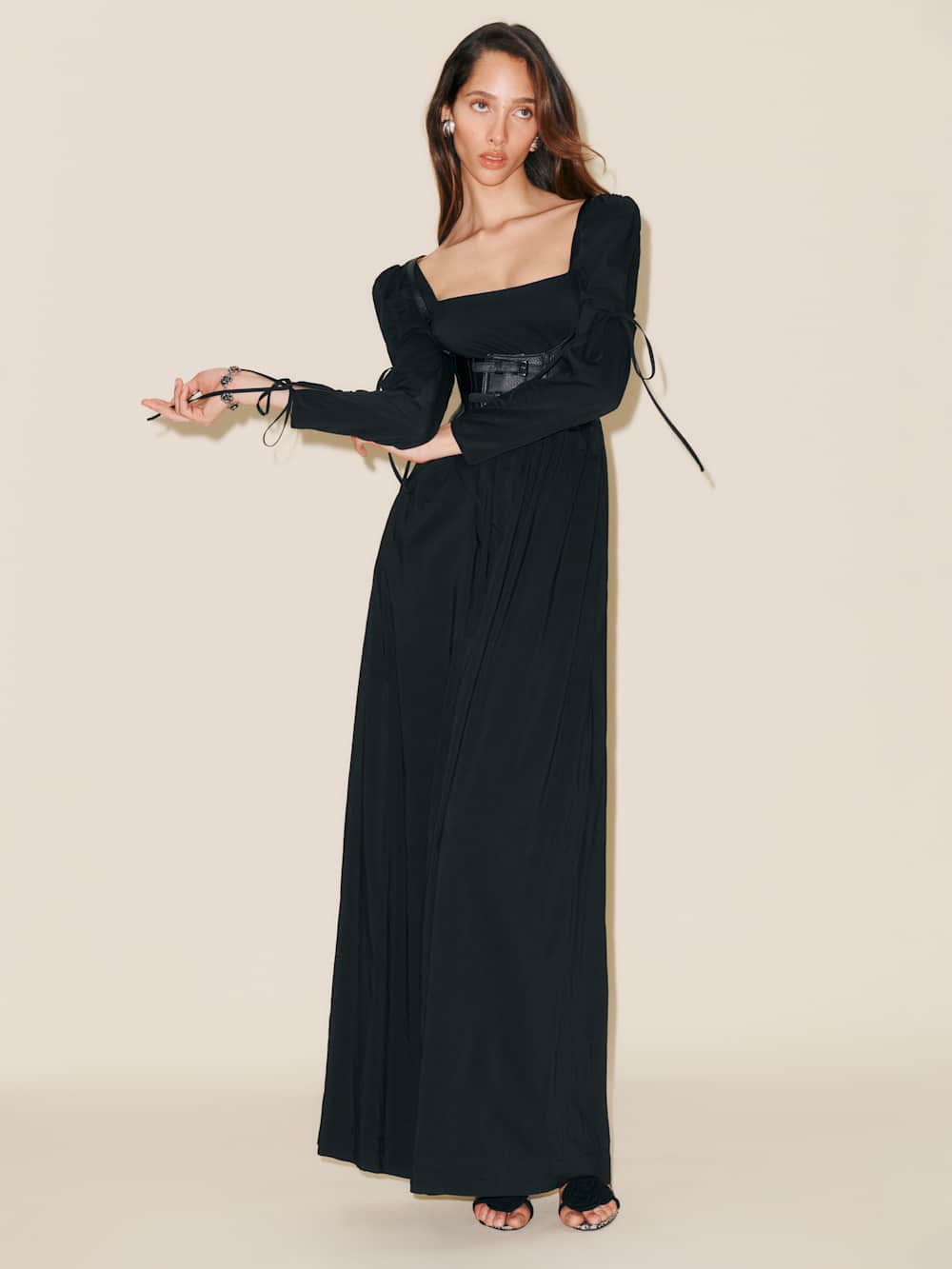 Splurge sustainably. Shop the Rhea Dress from Reformation, a full-length dress with long sleeves, a square neckline, and tie detailing along the arms.