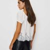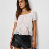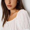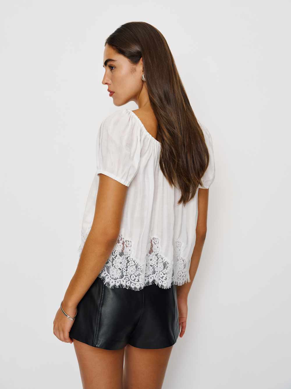 Detail oriented. Shop the Rhia Top from Reformation, a short-sleeved top with puff sleeves, a scoop neckline with a bow detail, and a scalloped lace hem.