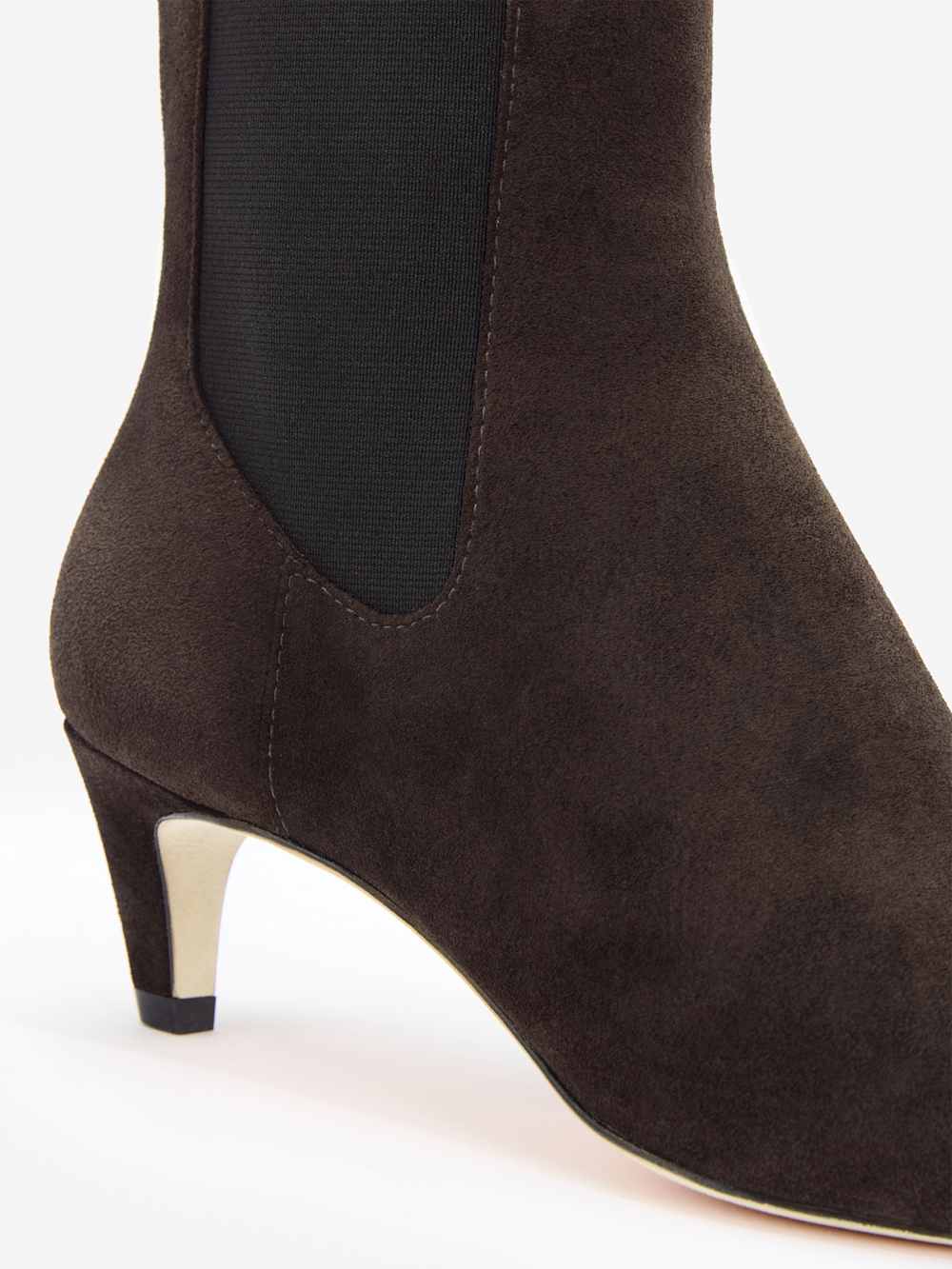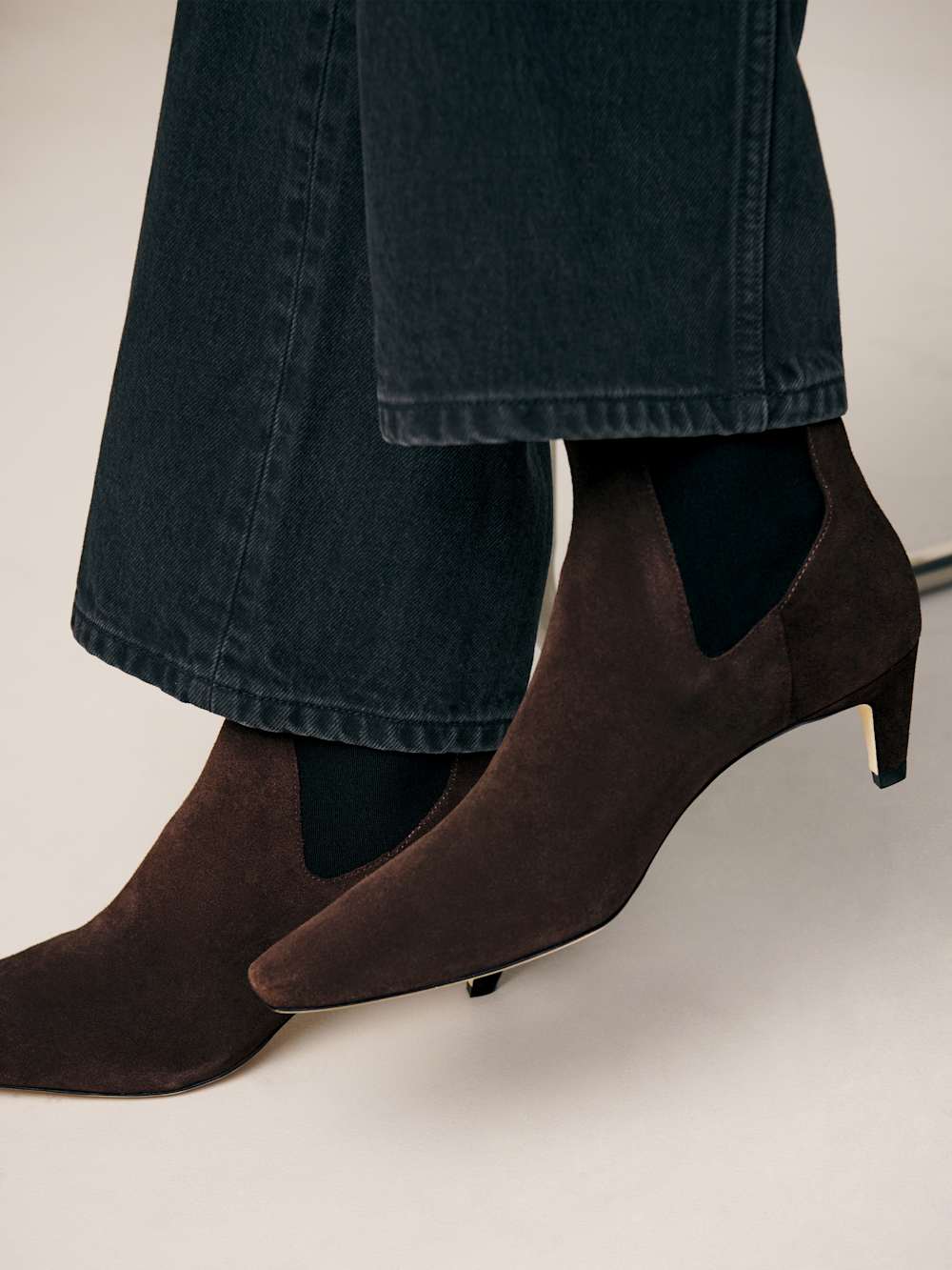 Put your best feet forward. Shop the Roberta Ankle Boot from Reformation, a pull on boot with a snip toe and a kitten heel.