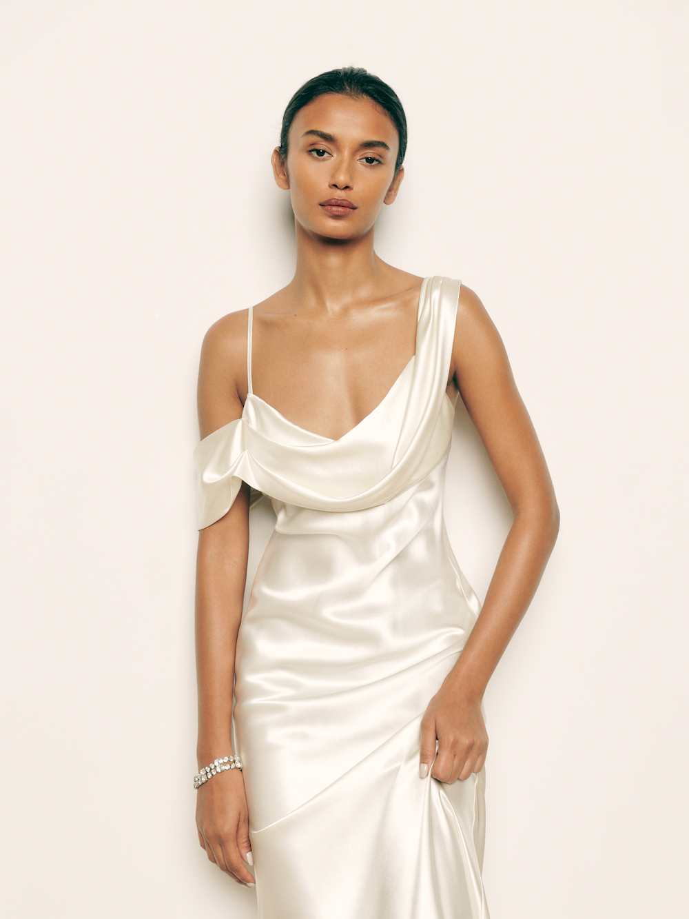Have a wedding? We can help. Shop the Ronda Silk Dress from Reformation, a one-shoulder, maxi dress with an asymmetric, cowl neckline.