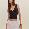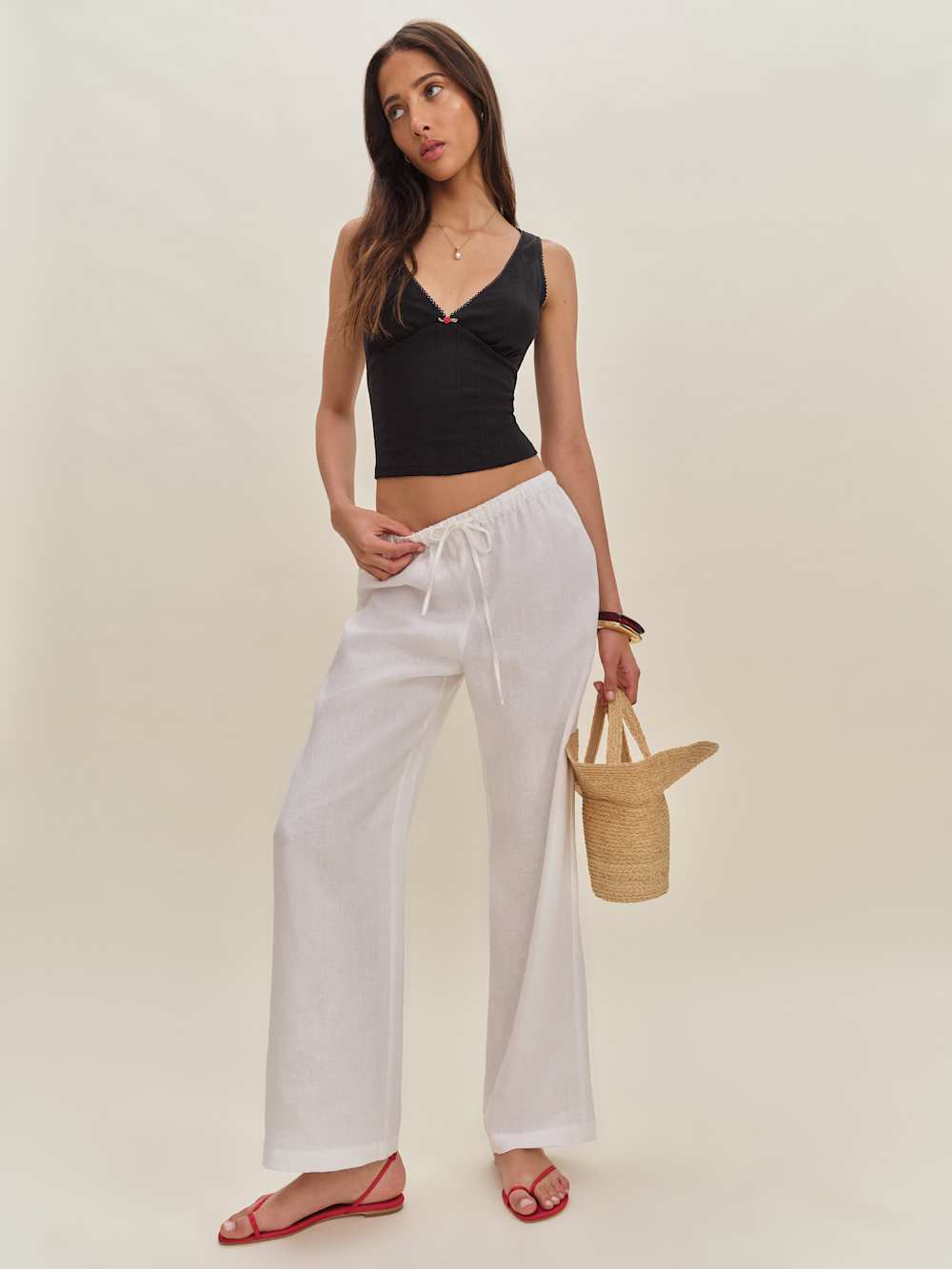 Up top. Shop the Rue Pointelle Knit Top from Reformation, a sleeveless knit tank with a v-neckline, scalloped trim, and bow detailing at the neck.