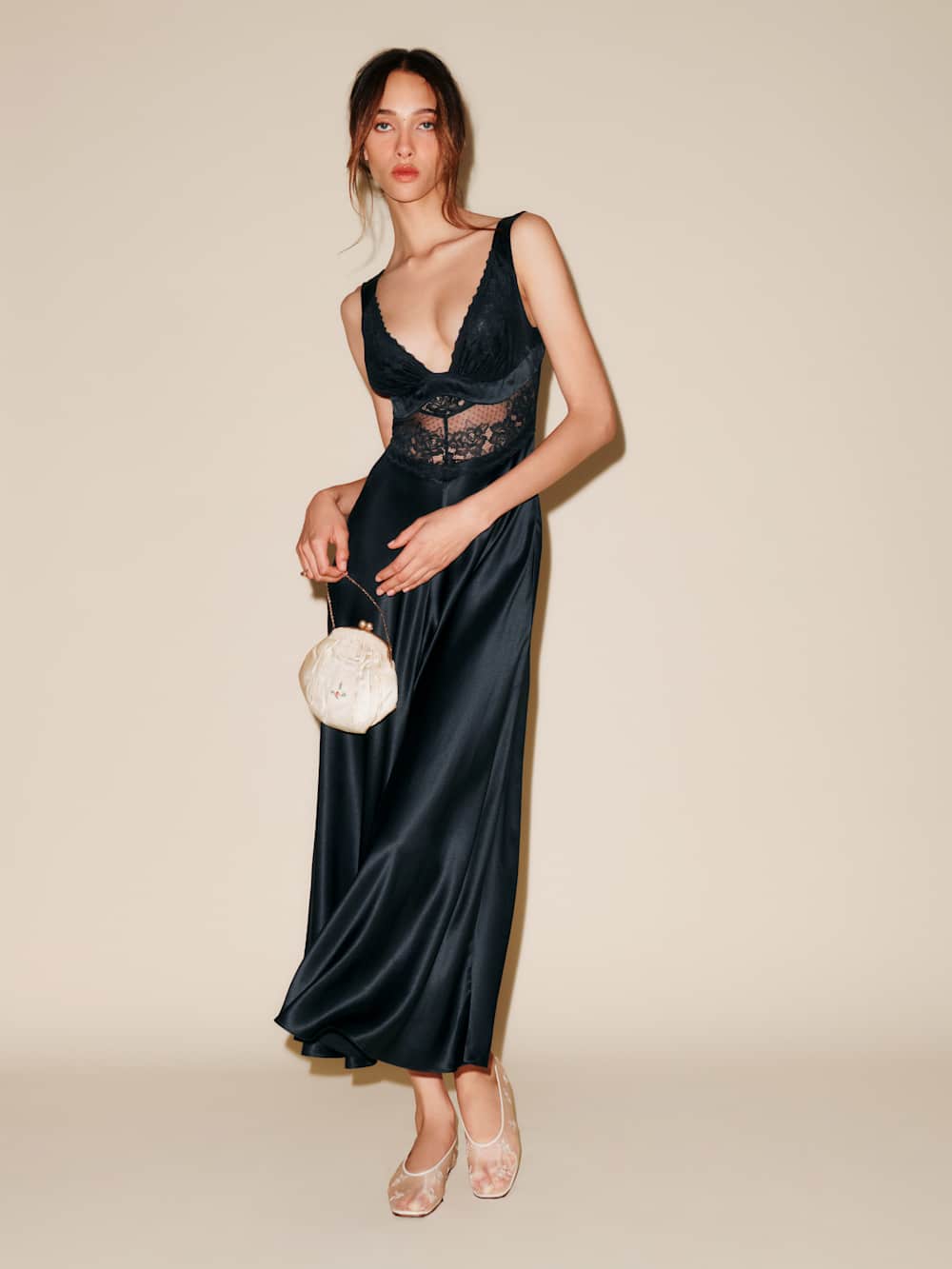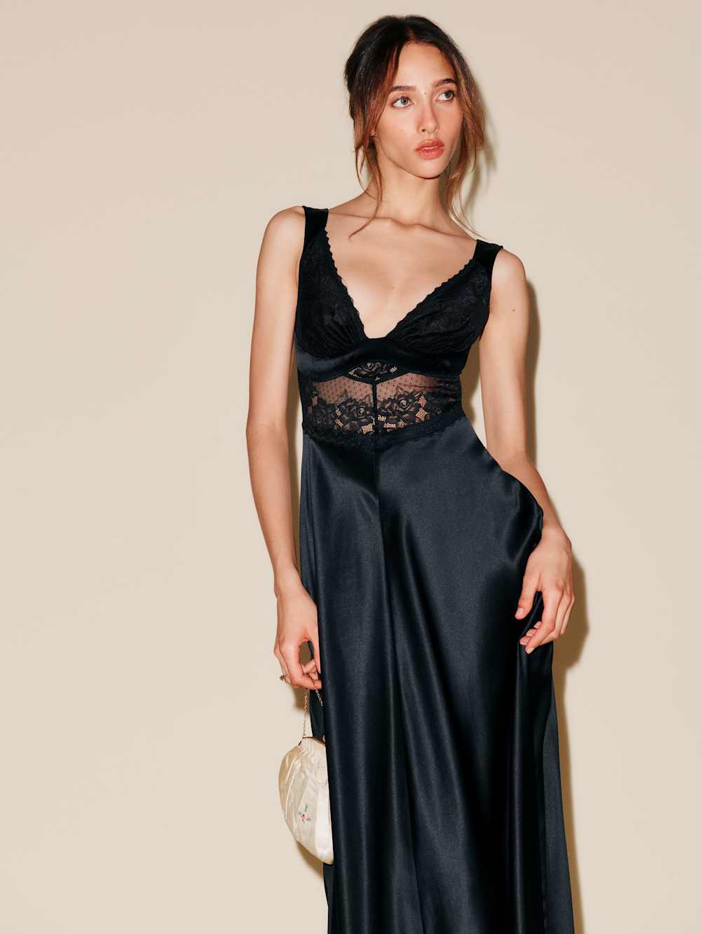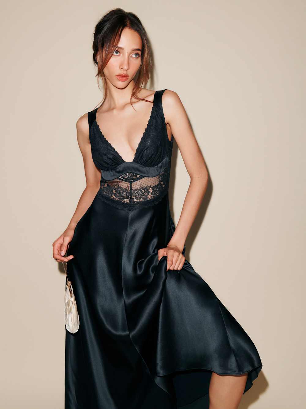 Have we met. Shop the Spruce Dress from Reformation, a sleeveless midi dress with a deep v-neckline and lace detailing throughout.