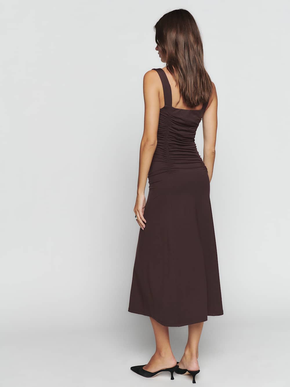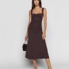 Dress up. Shop the Suvi Knit Dress from Reformation, a fitted, midi dress with a sweetheart neckline, tank straps and ruched bodice.