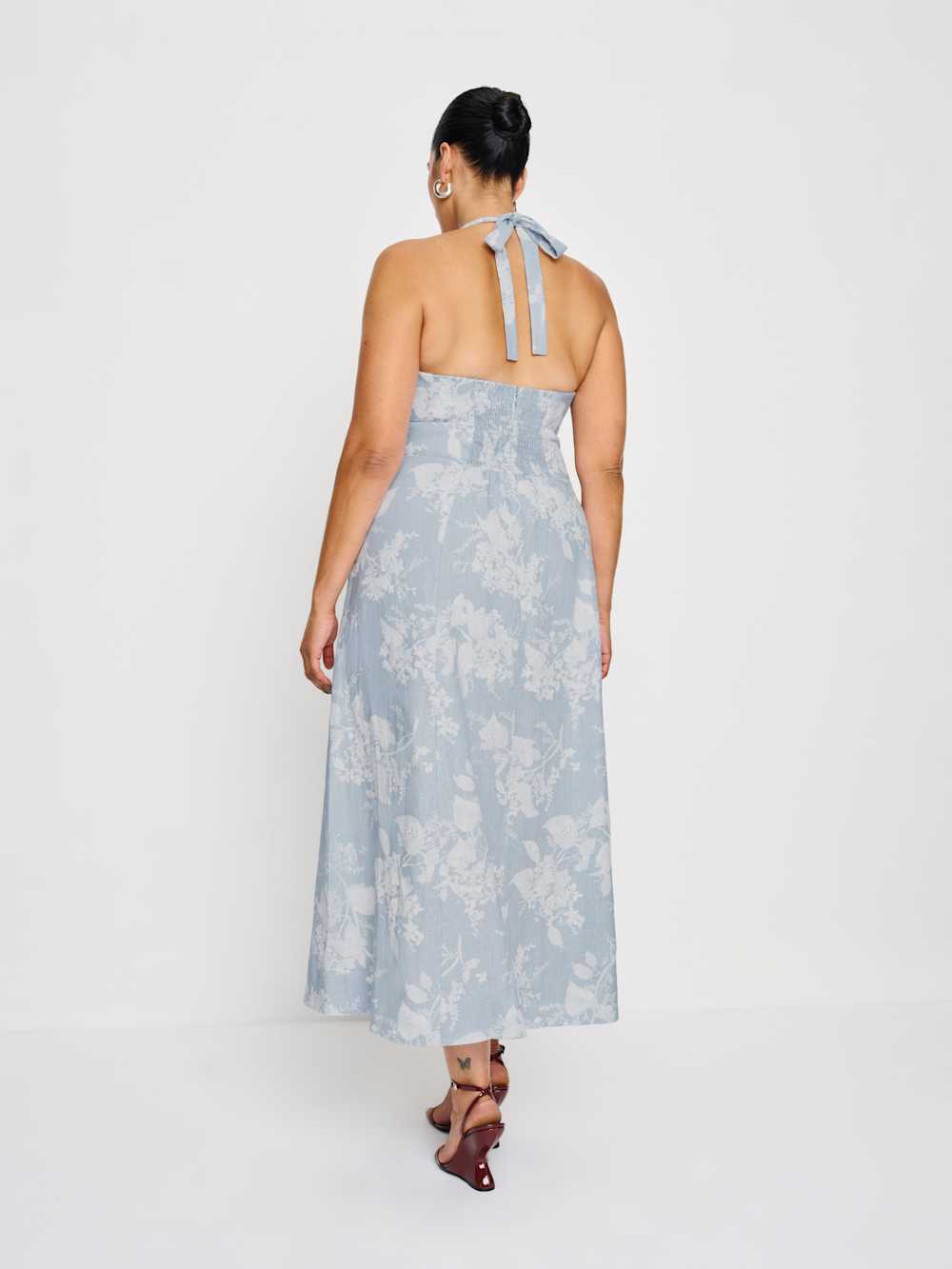 What do we have here? Shop the Tala Linen Dress ES from Reformation, a sleeveless midi dress with a sweetheart halter neckline, bust cup seams, a side slit.