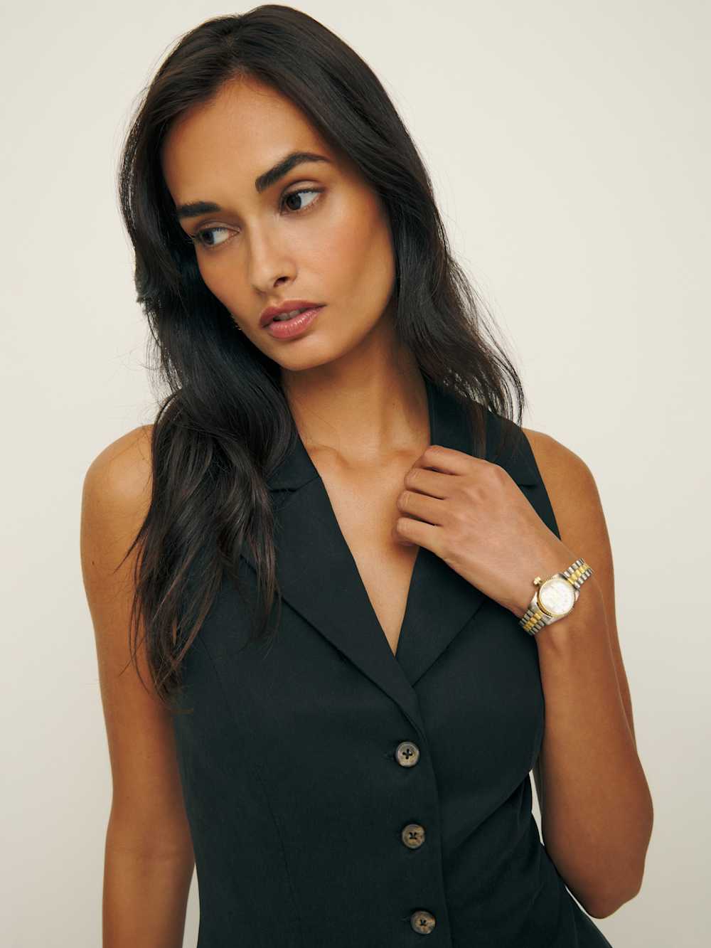 Package deal Shop the Taryn Two Piece from Reformation, a two piece set with a sleeveless vest top with center front buttons and a wide leg pant.