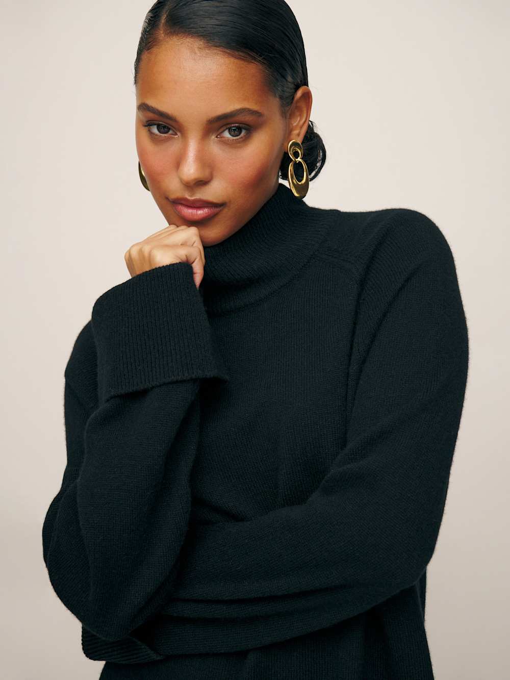 You flirt. Shop the Tate Regenerative Wool Sweater Dress from Reformation, a mini sweater dress with long sleeves and a slight turtle neckline.