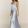 Who, me. Shop the Tatie Silk Dress from Reformation, a sleeveless maxi dress with a V-neckline, an open back, and floral lace embellishments on the front.