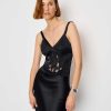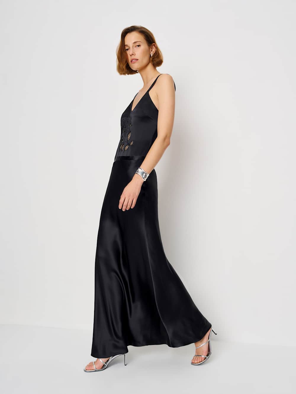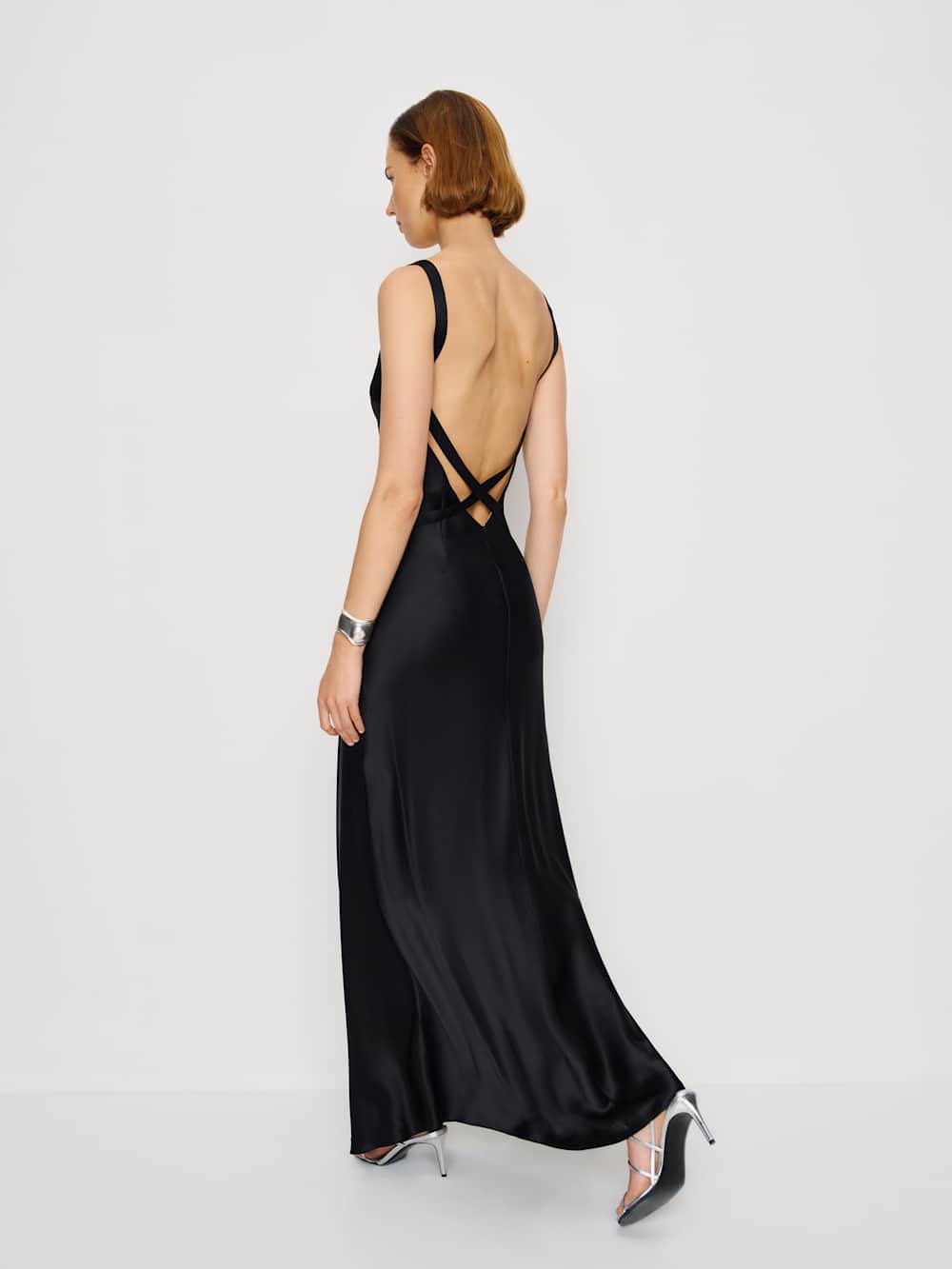 Who, me. Shop the Tatie Silk Dress from Reformation, a sleeveless maxi dress with a V-neckline, an open back, and floral lace embellishments on the front.