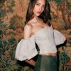 You must be new. Shop the Thayer Top from Reformation, an off the shoulder neckline top with puff sleeves, and a zipper down the front.