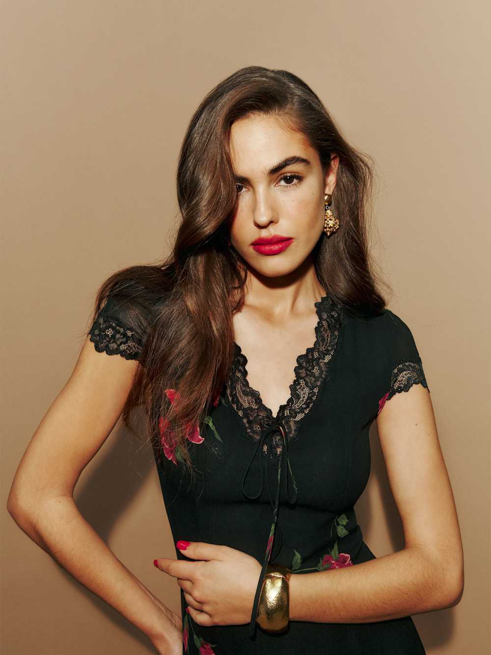 Romance alert. Shop the Tiffie Dress from Reformation, a midi length dress with a v neckline, cap sleeves, and tie detail at the neckline.