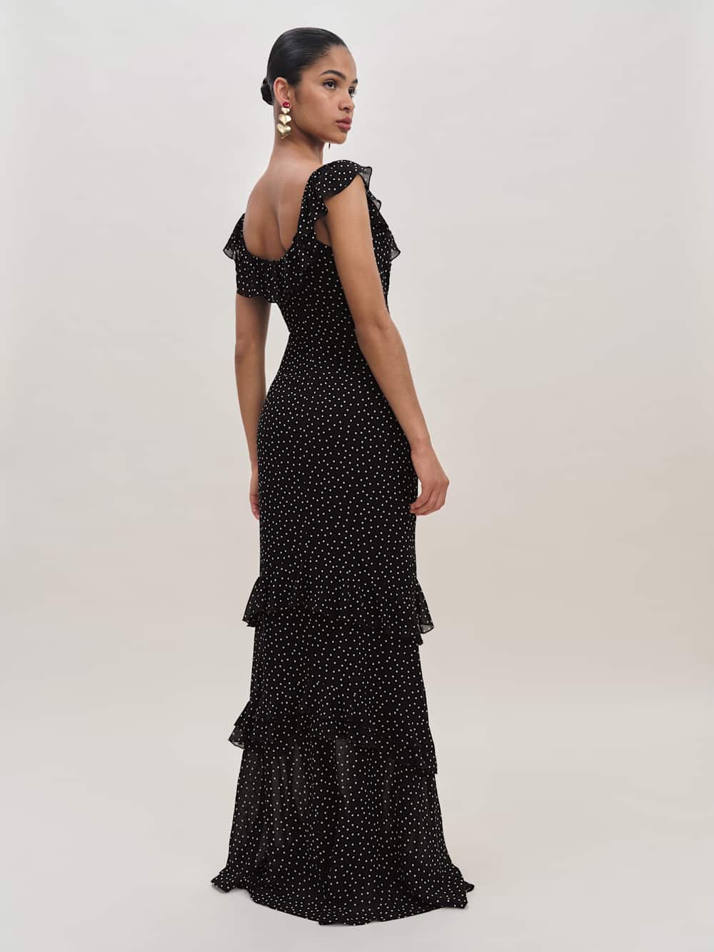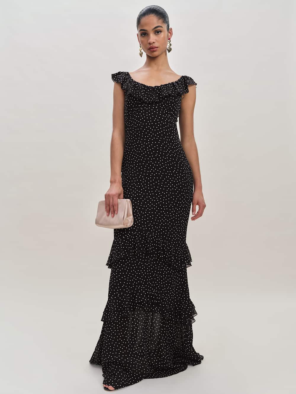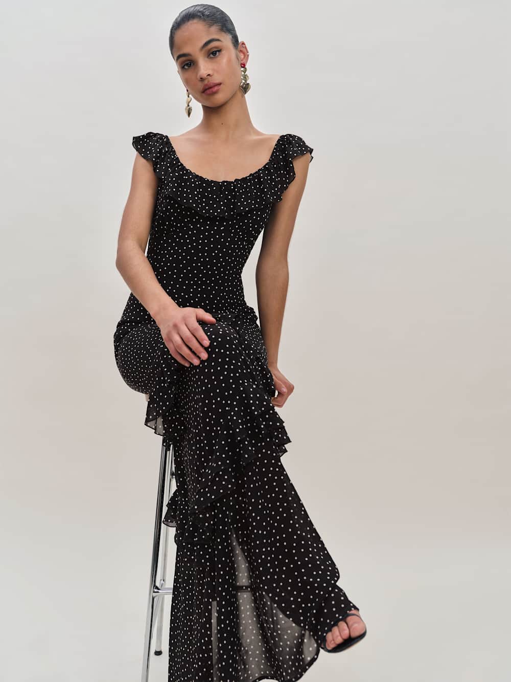 Romance alert. Shop the Tripoli Dress from Reformation, a maxi dress with a scoop neckline, ruffle detailing, and tiered ruffles throughout.