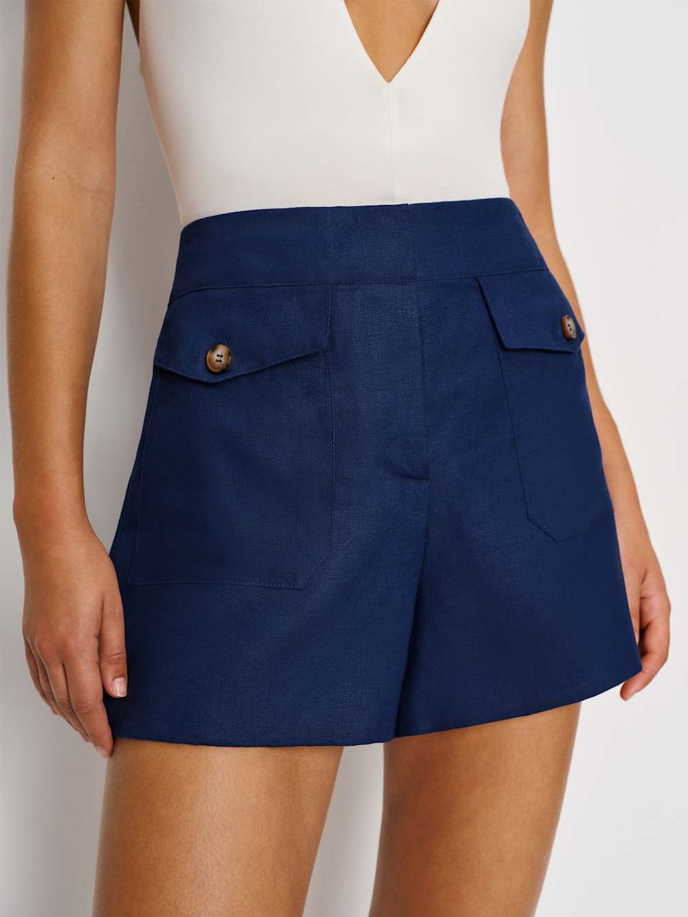 For when the temps go up. Shop the Trixie Linen Short from Reformation, a high-rise short with a straight leg fit and front patch pockets with buttons.