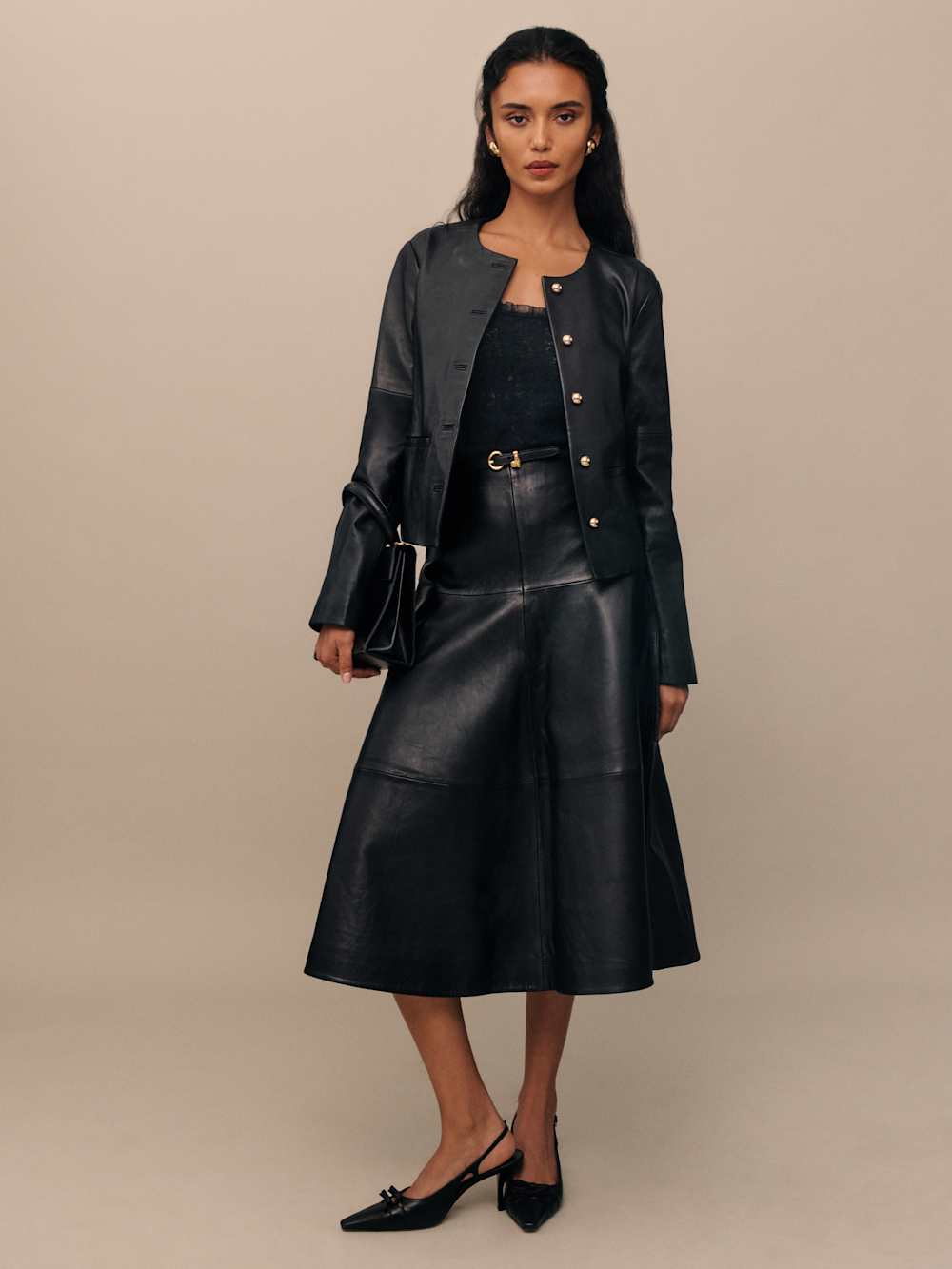 Wear the skirt. Shop the Veda Carmen Leather Skirt from Reformation, a high rise midi skirt with a flared silhouette and seam detailing.