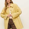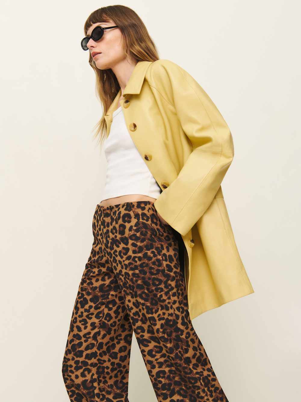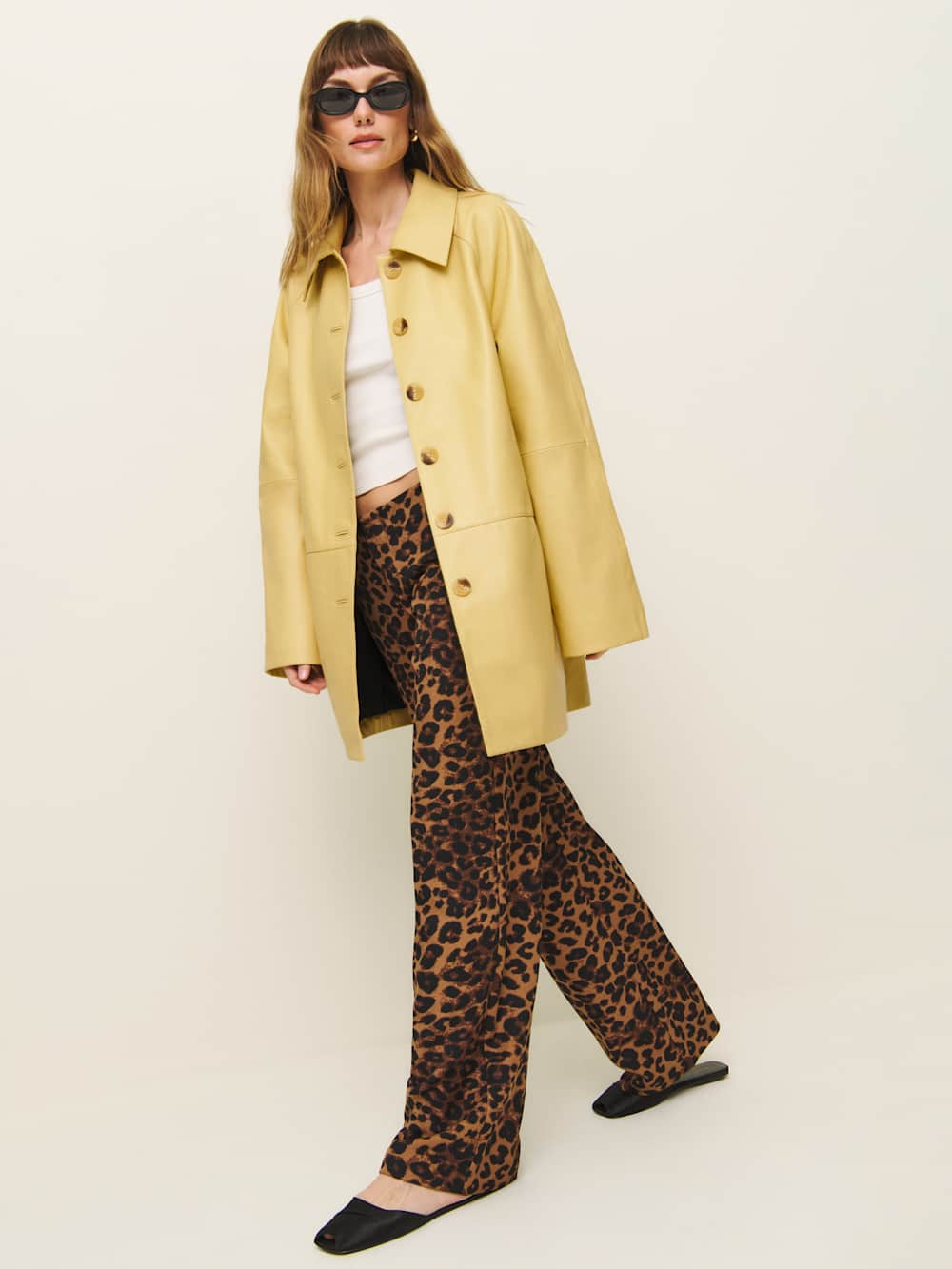 Layer up. Shop the Veda Celine Leather Jacket from Reformation, an oversized leather jacket with a collared neckline and button front.