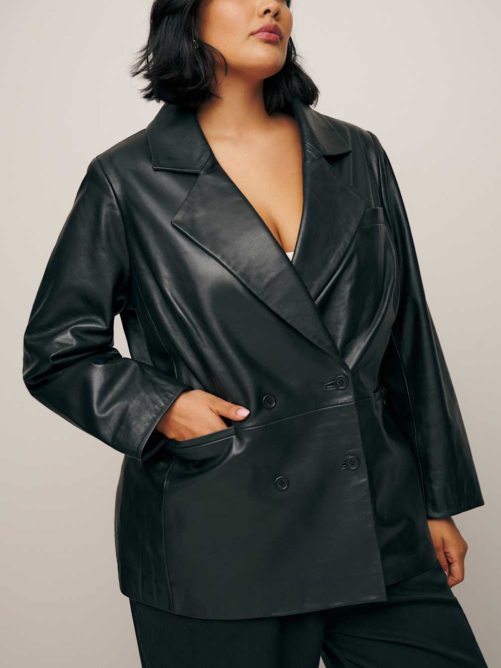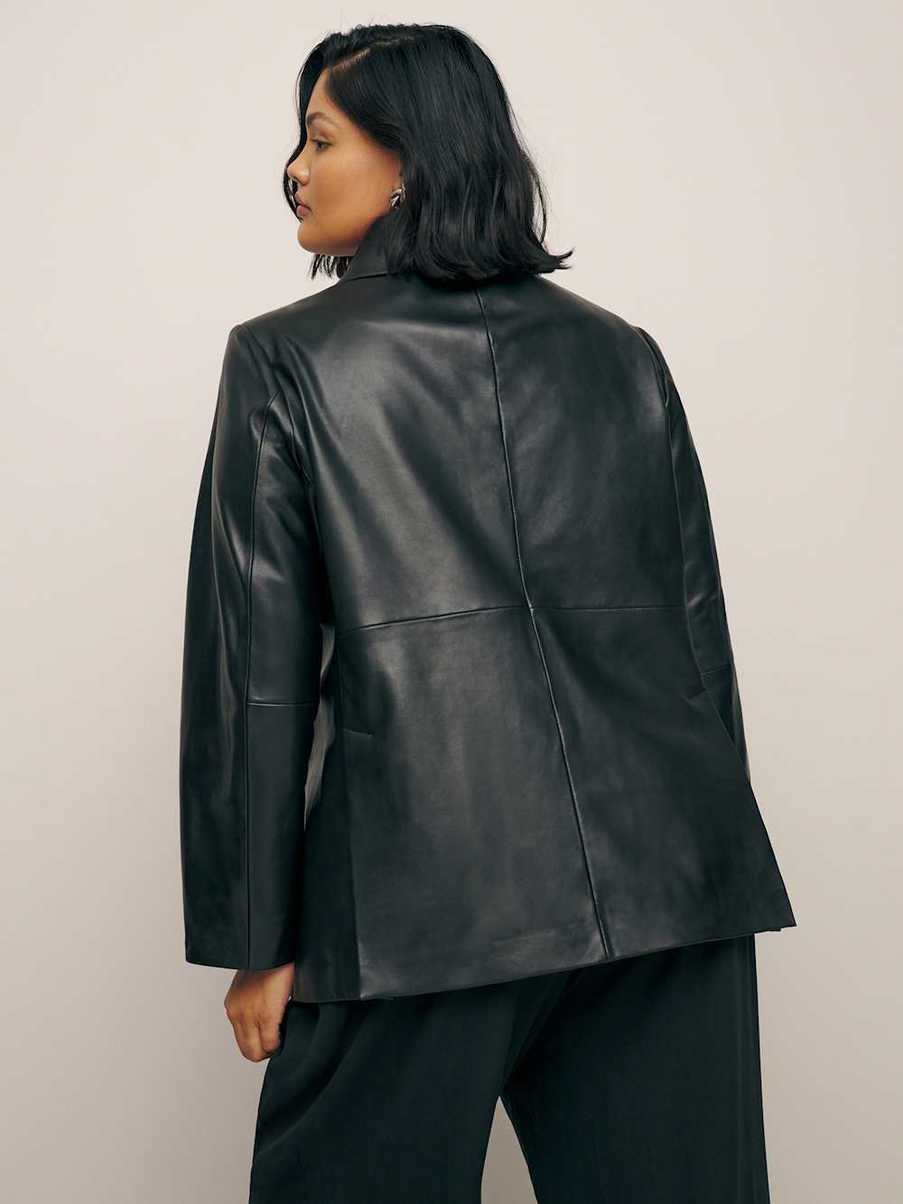 Time to add sleeves. Shop the Veda Dalia Relaxed Leather Blazer ES from Reformation, a relaxed fitting blazer with front pockets and a collared neckline.