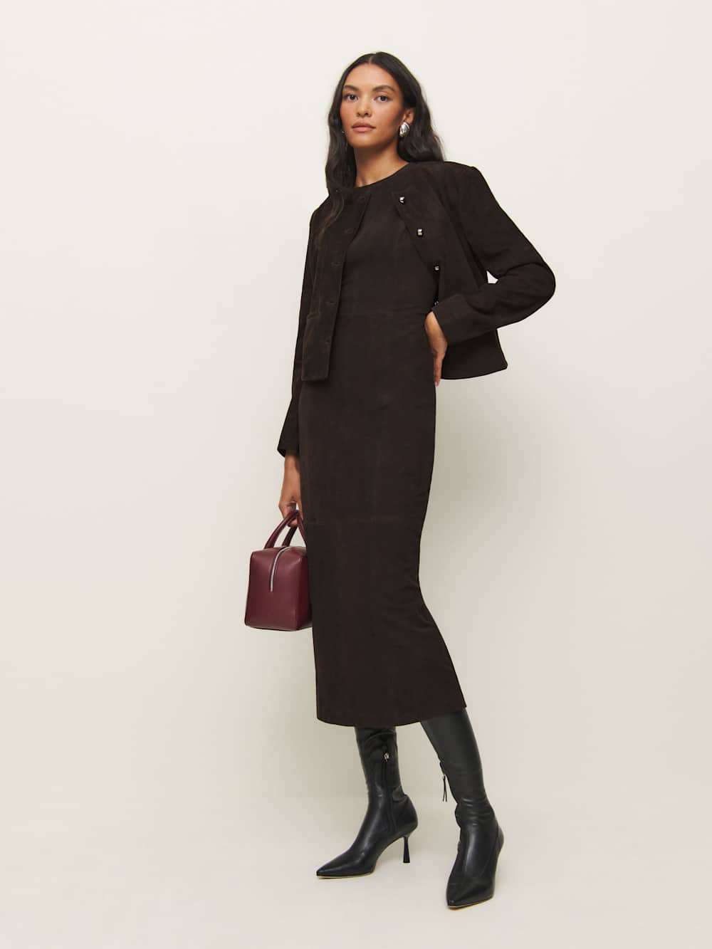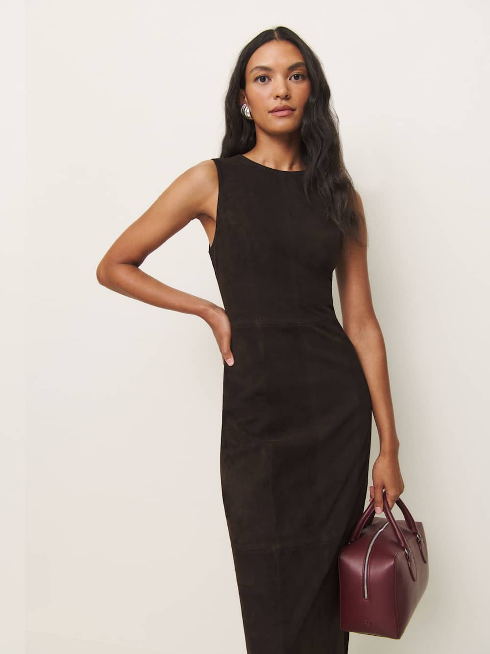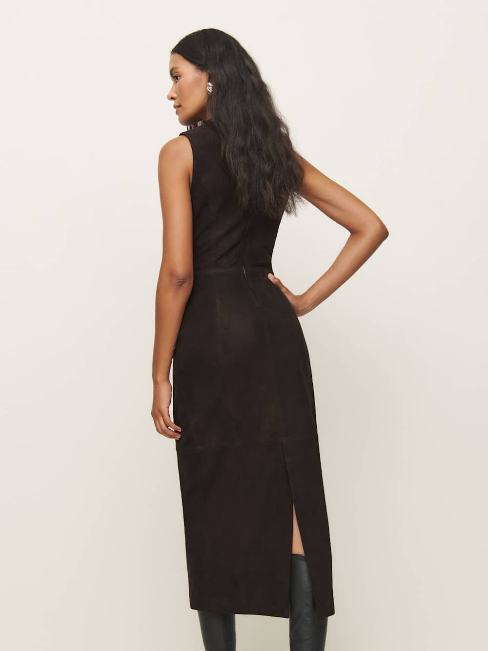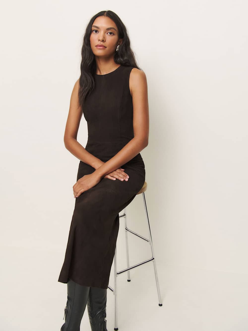 In case of getting dressed. Shop the Veda Kendi Leather Dress from Reformation, a sleeveless midi dress with a high neckline.