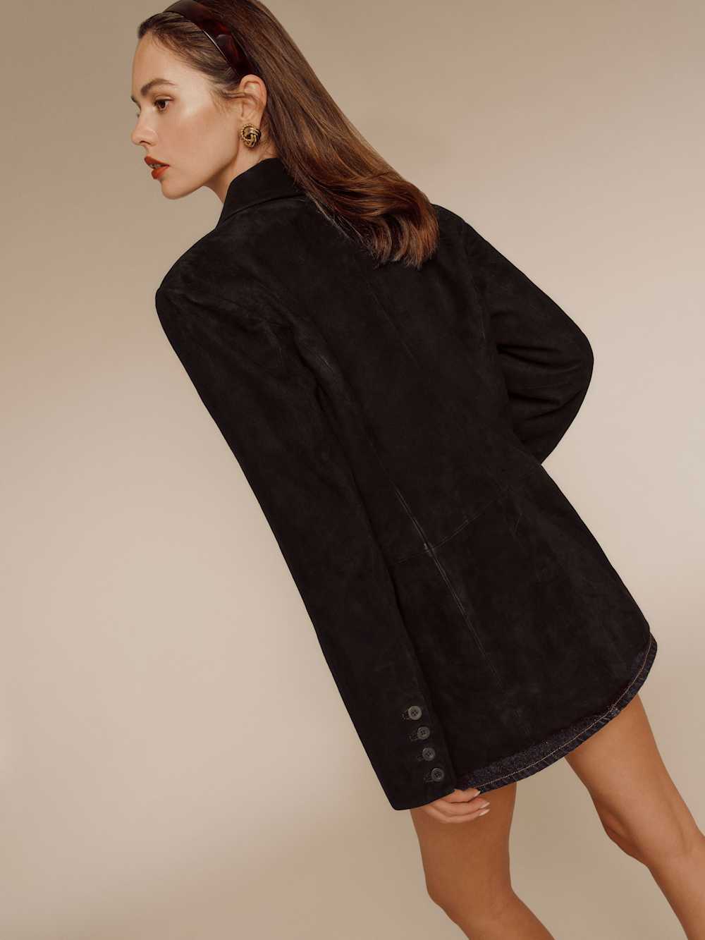 Layer up. Shop the Veda Leon Oversized Blazer from Reformation, an oversized suede blazer with a button closure and front pockets.