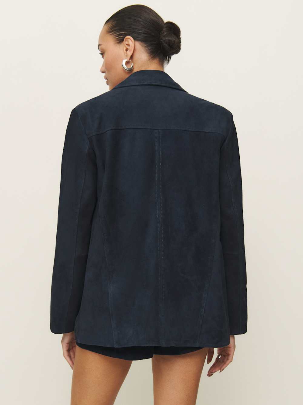 It’s jacket season. Shop the Veda Lincoln Suede Shirt Jacket from Reformation, a shirt jacket with a button front, collared neckline, and side pockets.