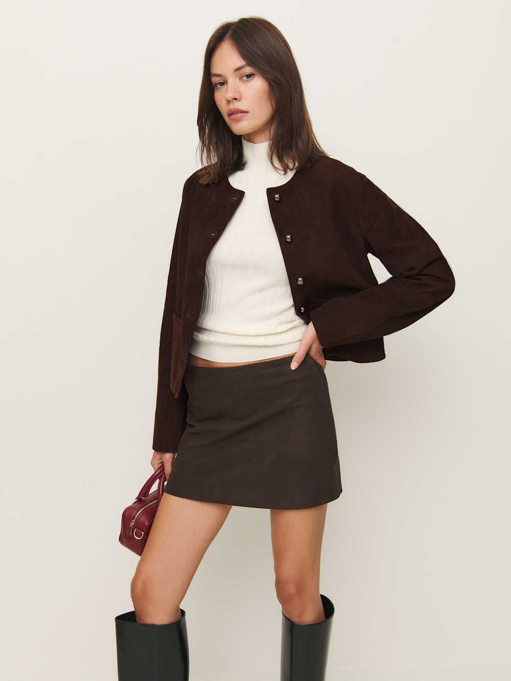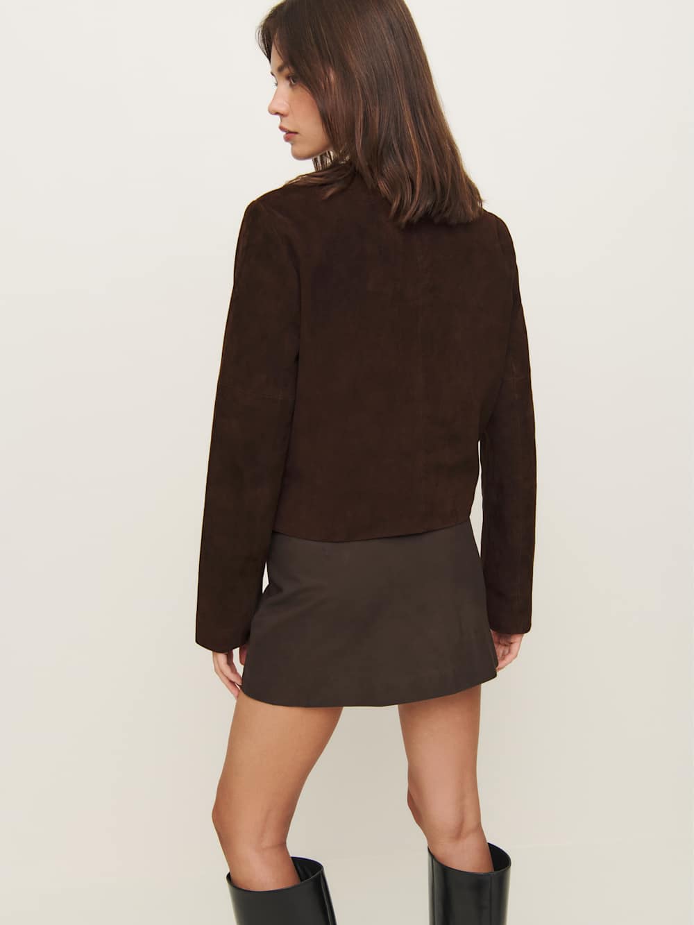 Layer up. Shop the Veda Reed Leather Jacket from Reformation, a collarless jacket with a button front and front pockets.