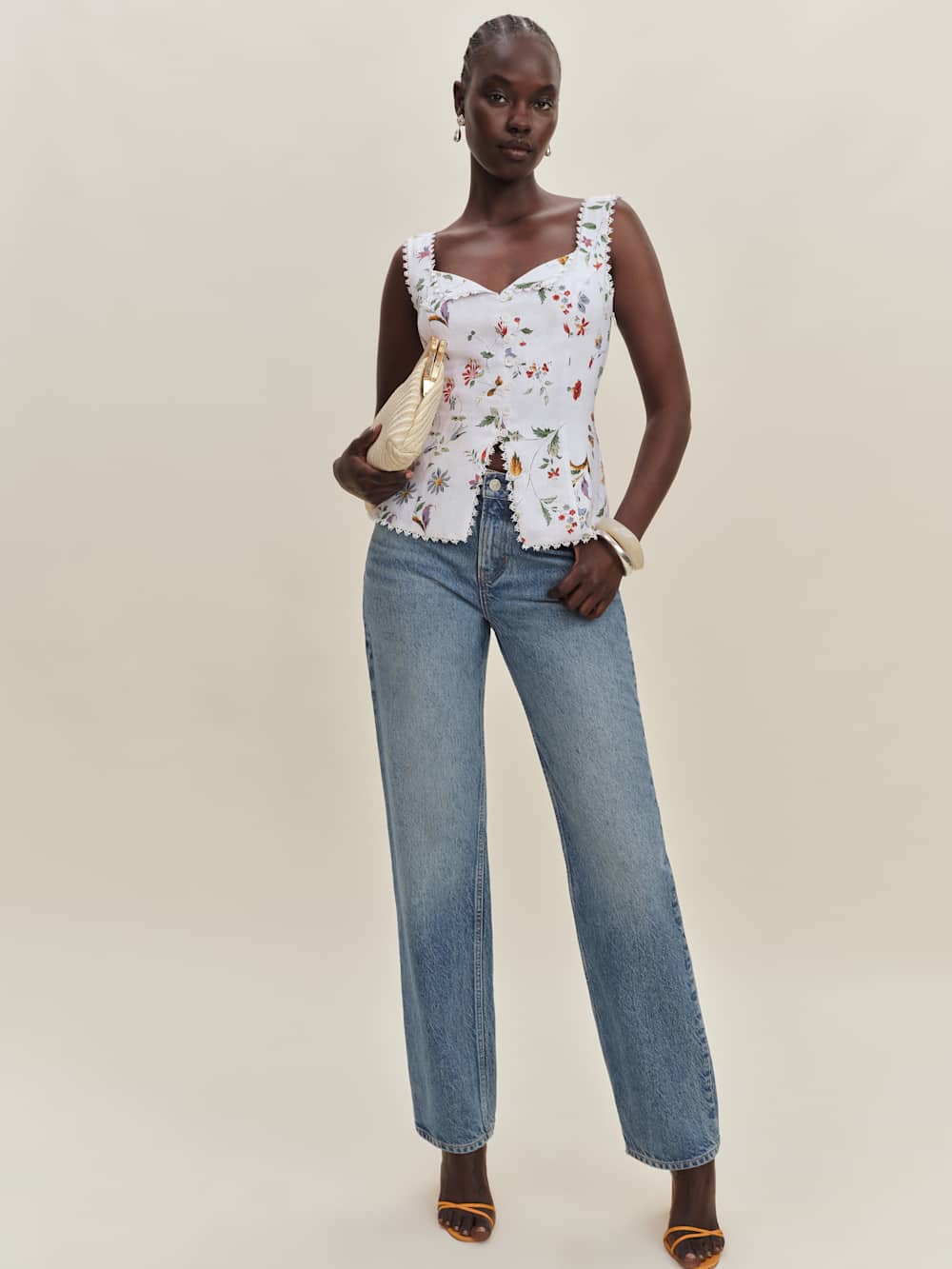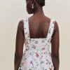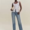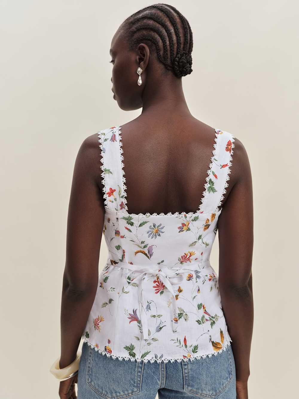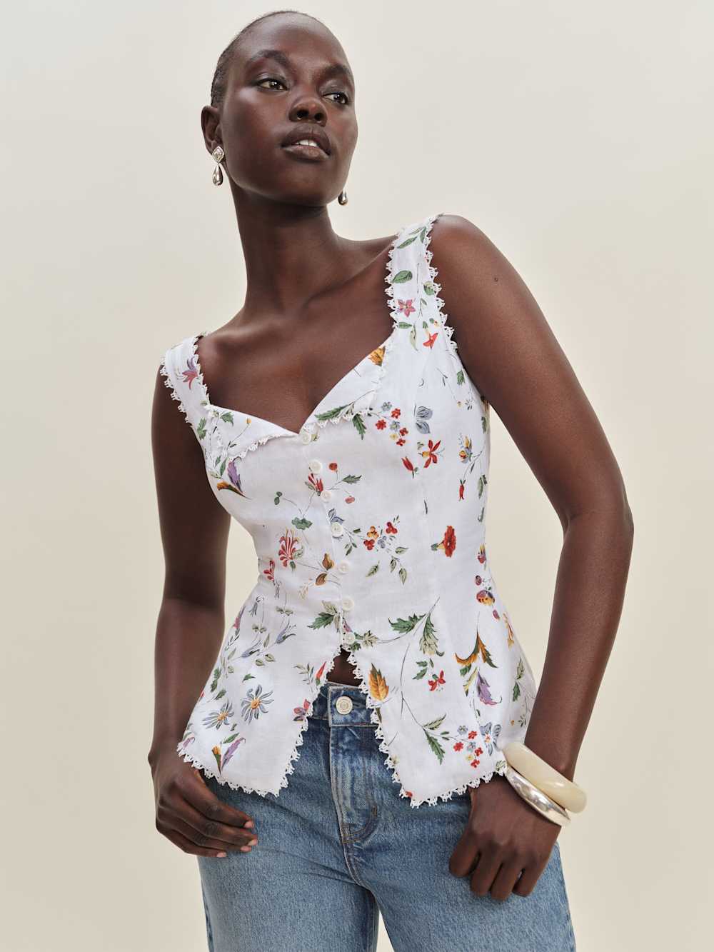 Up top. Shop the Viola Linen Top from Reformation, a sleeveless top with a sweetheart neckline, button front, lace trim, and split hem.