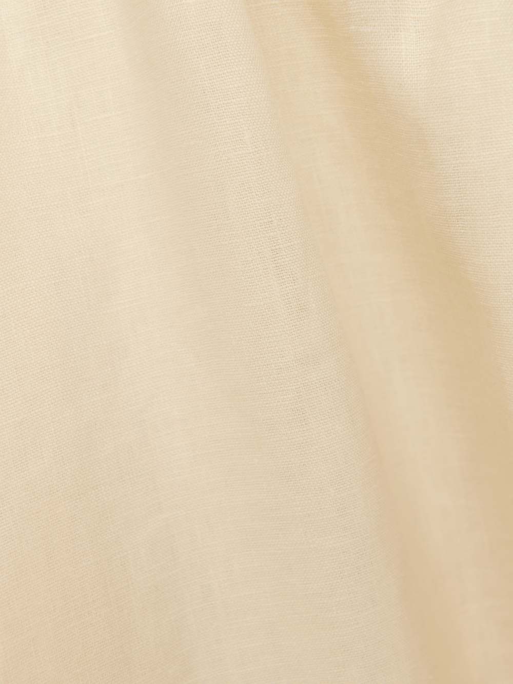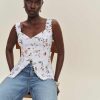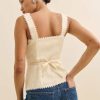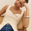 Up top. Shop the Viola Linen Top from Reformation, a sleeveless top with a sweetheart neckline, button front, lace trim, and split hem.