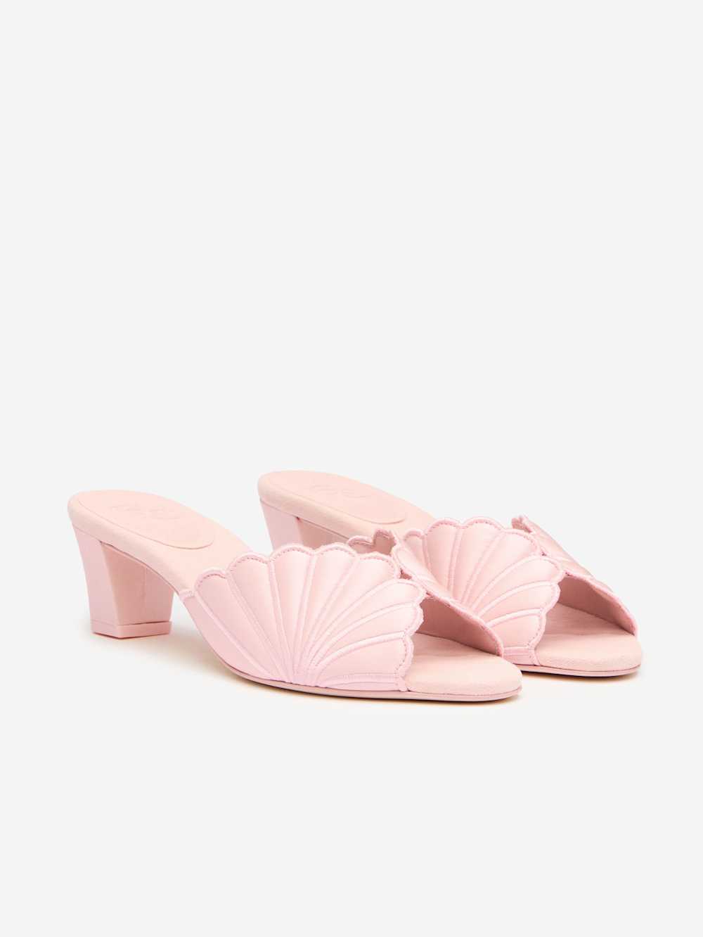 Wear me. Shop the Waldena Block Heeled Mule from Reformation, a mule sandal with a block heel, peep toe, and shell design at the upper.