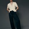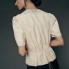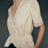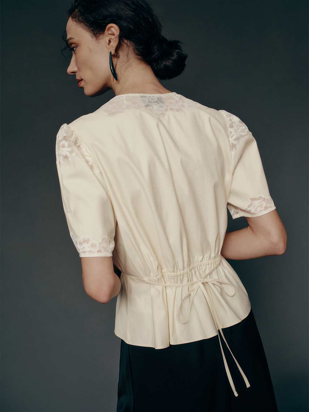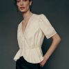 Up top. Shop the WAYNE TOP from Reformation, a short-sleeve top with a deep V-neckline, zip front, ruching at the waist, and lace detailing throughout.