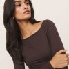 On top of it. Shop the Wiley Knit Top from Reformation, a long sleeve top, with a boat neck. It’s tight fitting throughout for a more defined look.