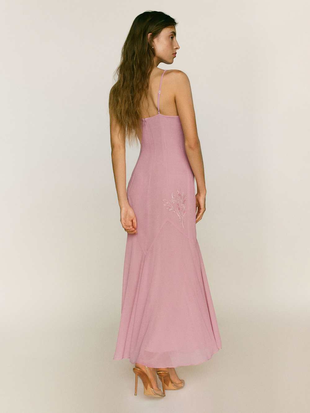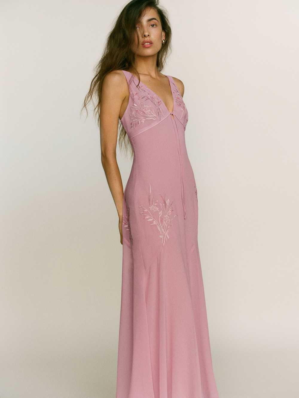 You flirt. Shop the Ziva Dress from Reformation, a sleeveless maxi dress with a V-neckline, an adjustable tie at the bust, and embellishment details.