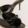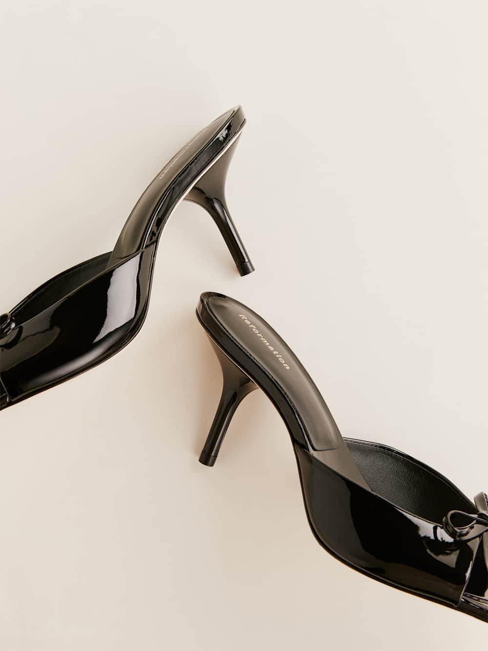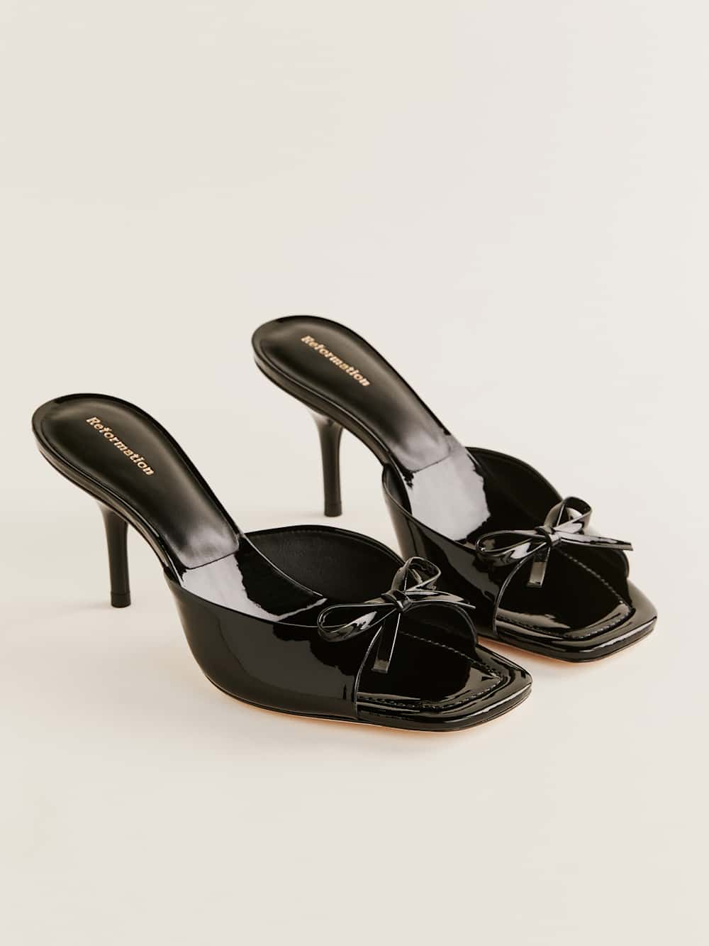 A great pair. Shop the Clementine Heeled Mule Sandal from Reformation, a mule sandal with a skinny heel, square peep toe, and bow detail on the upper.