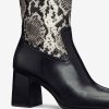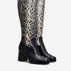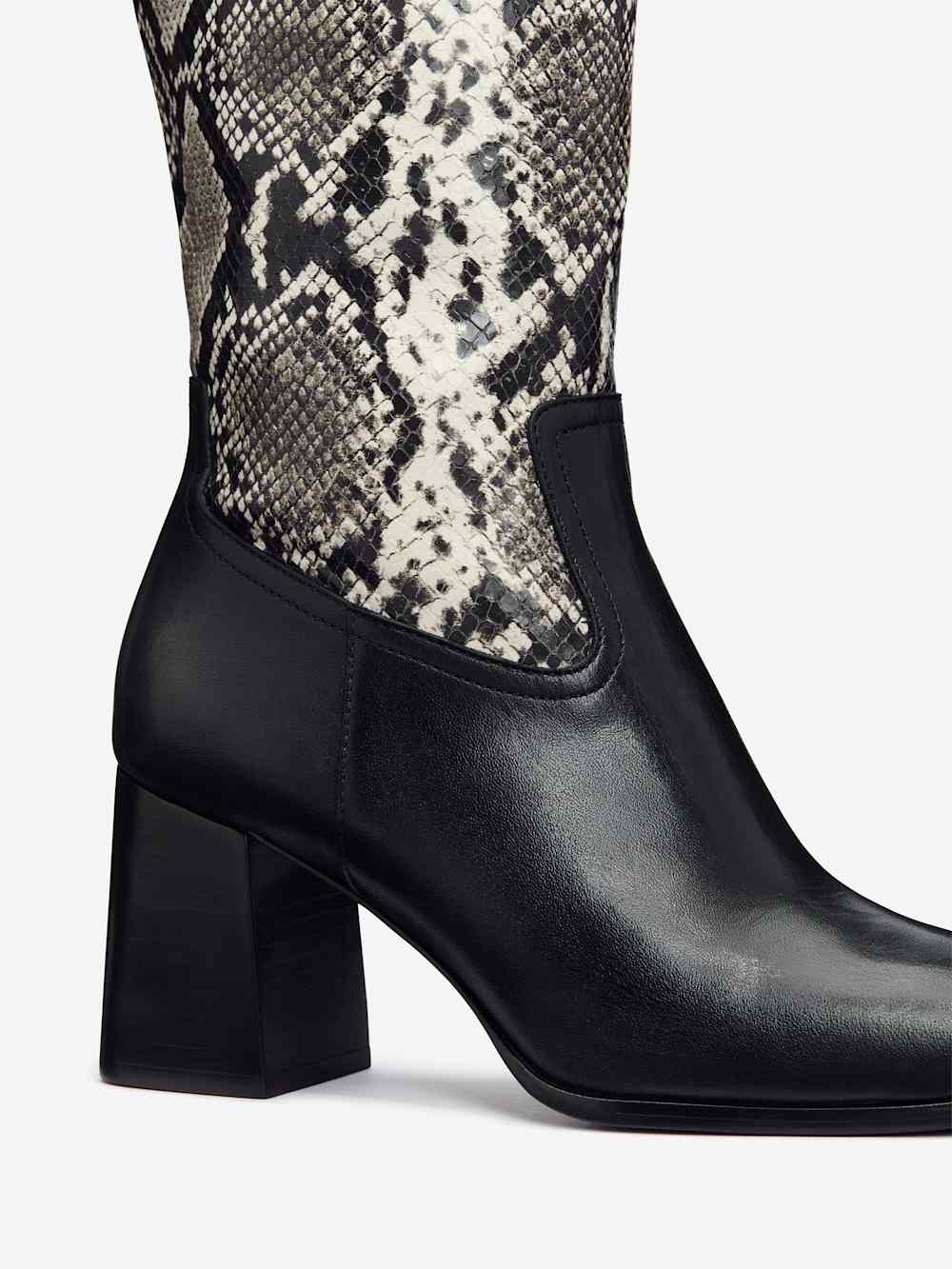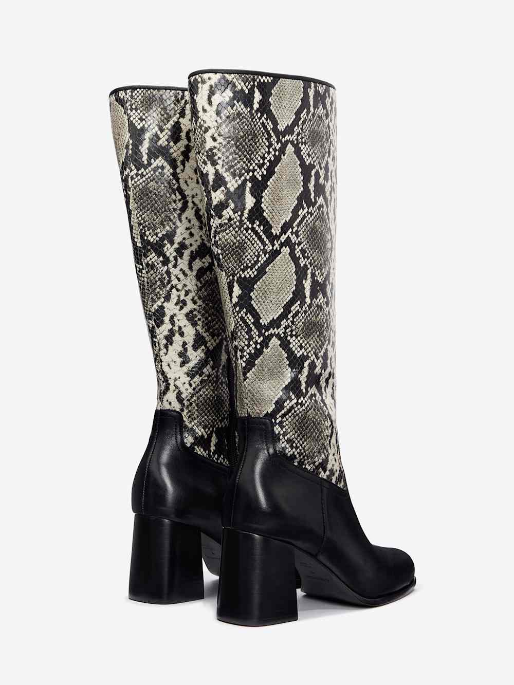 Upper is made from an embossed and printed snake pattern on cow leather. Spot clean.
