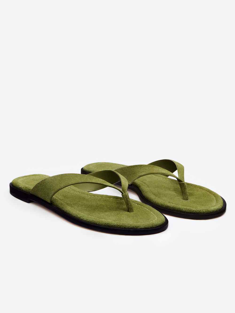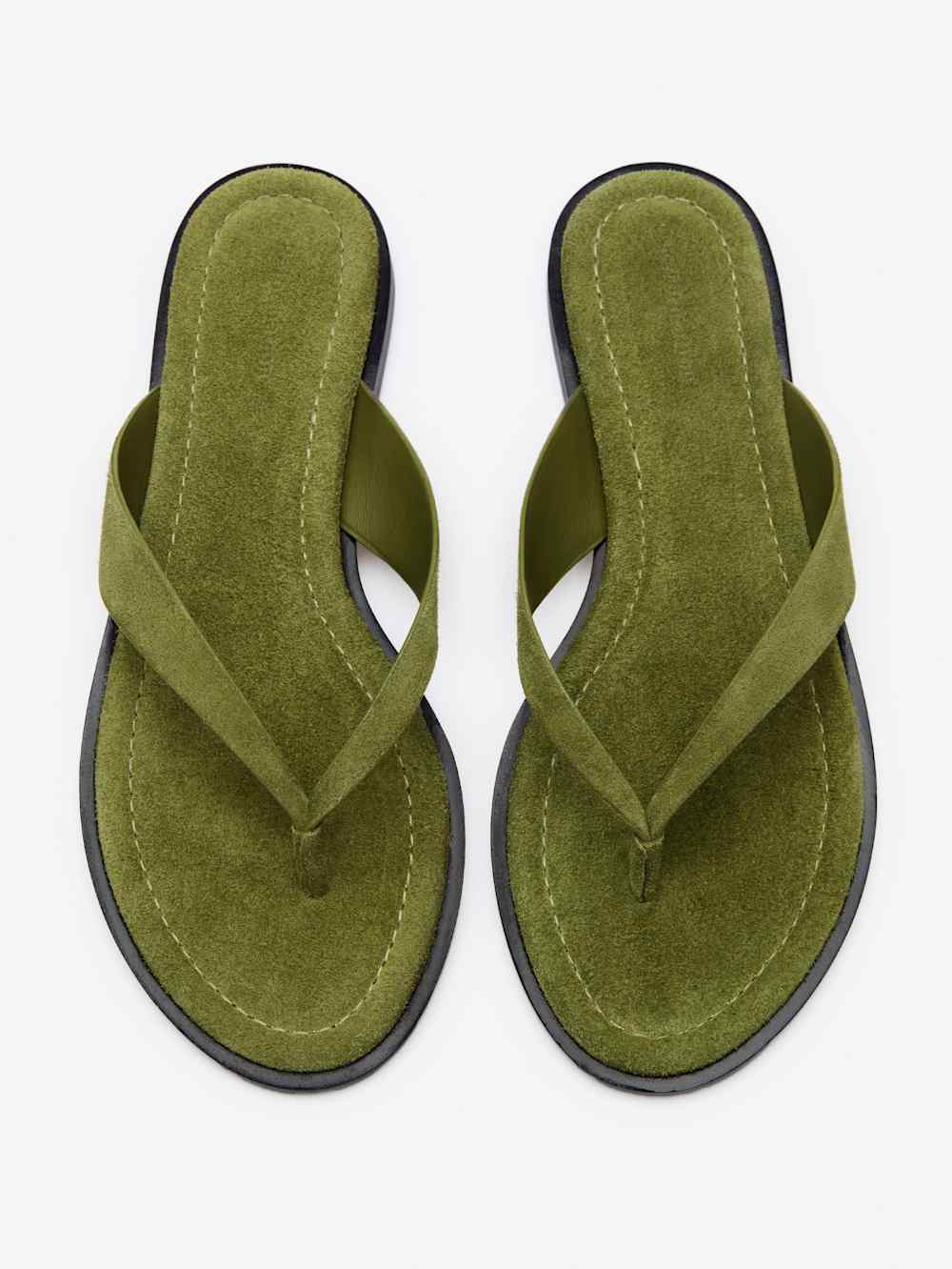 Show some foot. Shop the Jessie Thong Sandal from Reformation, a flat thong sandal with a padded footbed for extra comfort. Runs true to size.