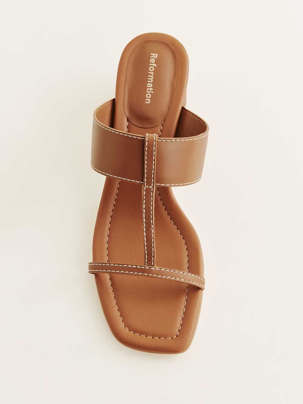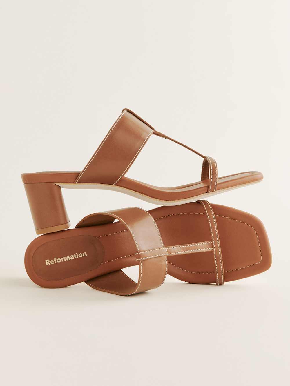 Wear me. Shop the Sardinia Heeled Sandal from Reformation, an slip-on heeled sandal with an open toe, caging at the upper, and contrast stitching.