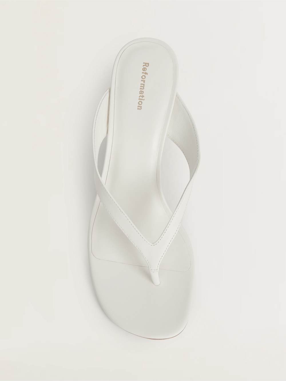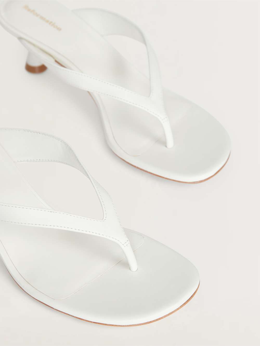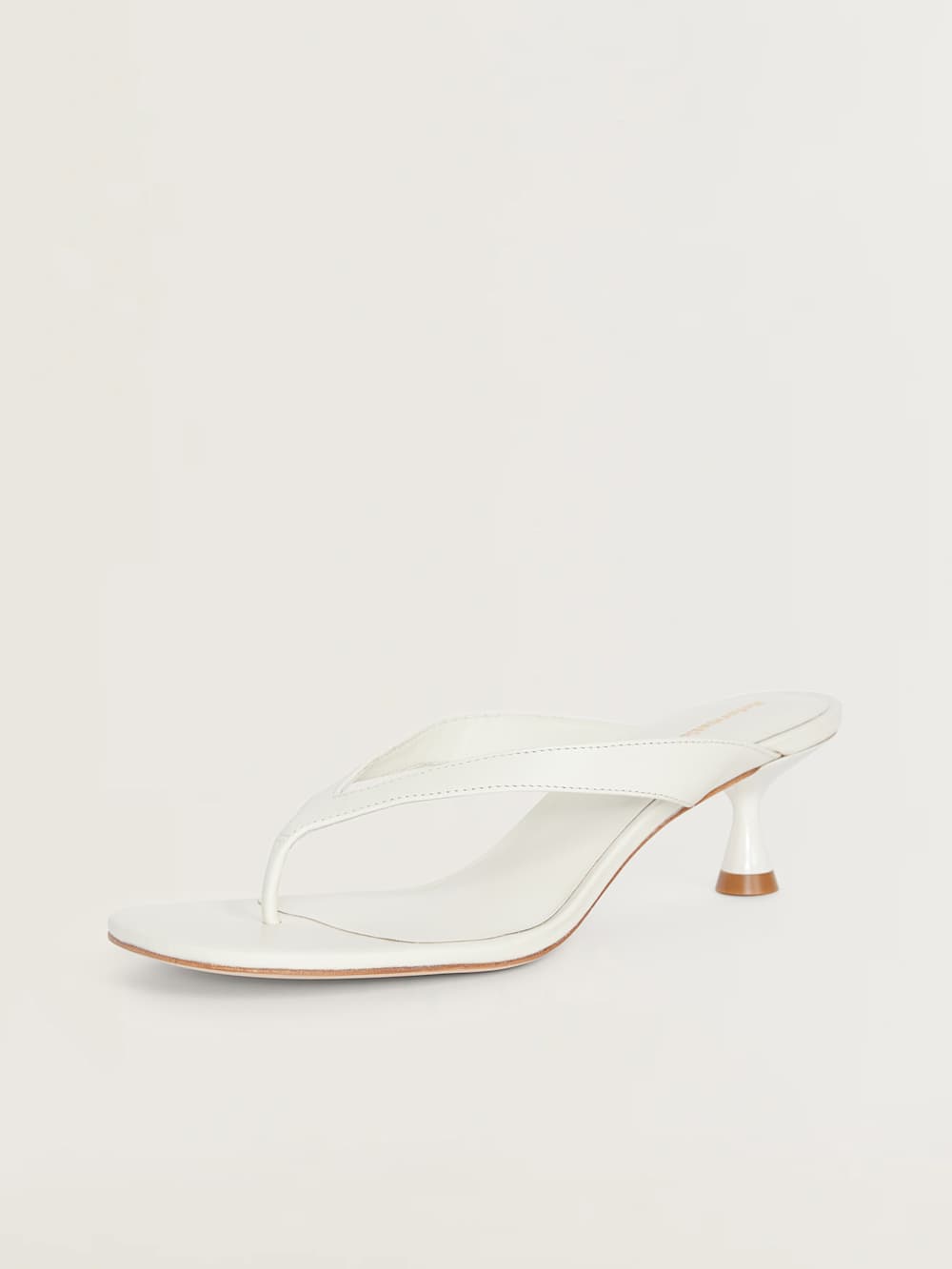Hello summer! Shop the Sophie Heeled Sandal from Reformation, a modern update to the Y2K heeled thong. This shoe features a square toe and a 50mm kitten heel.