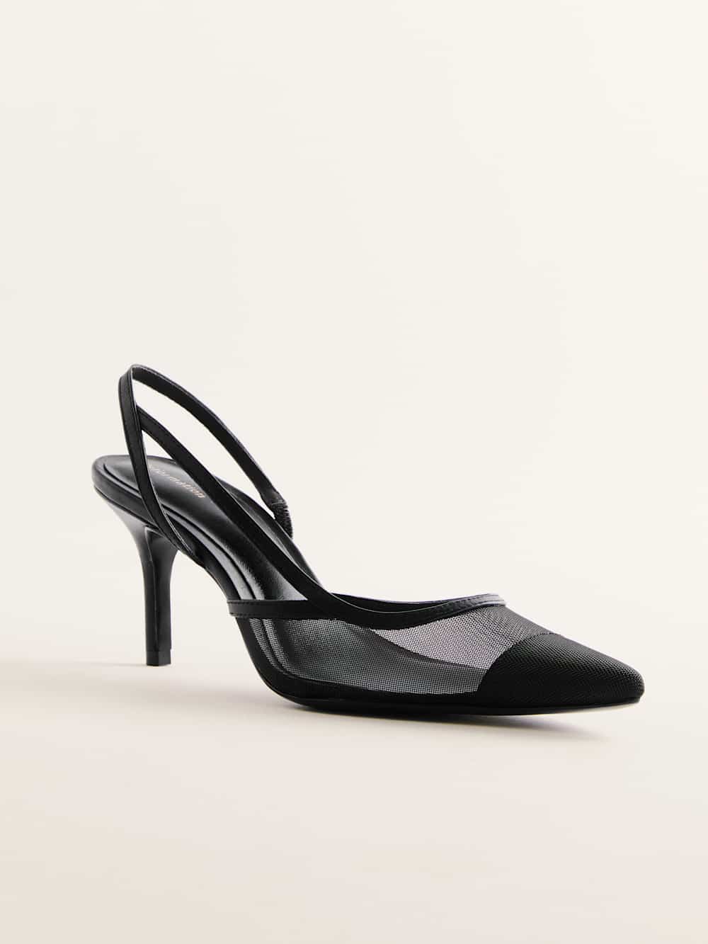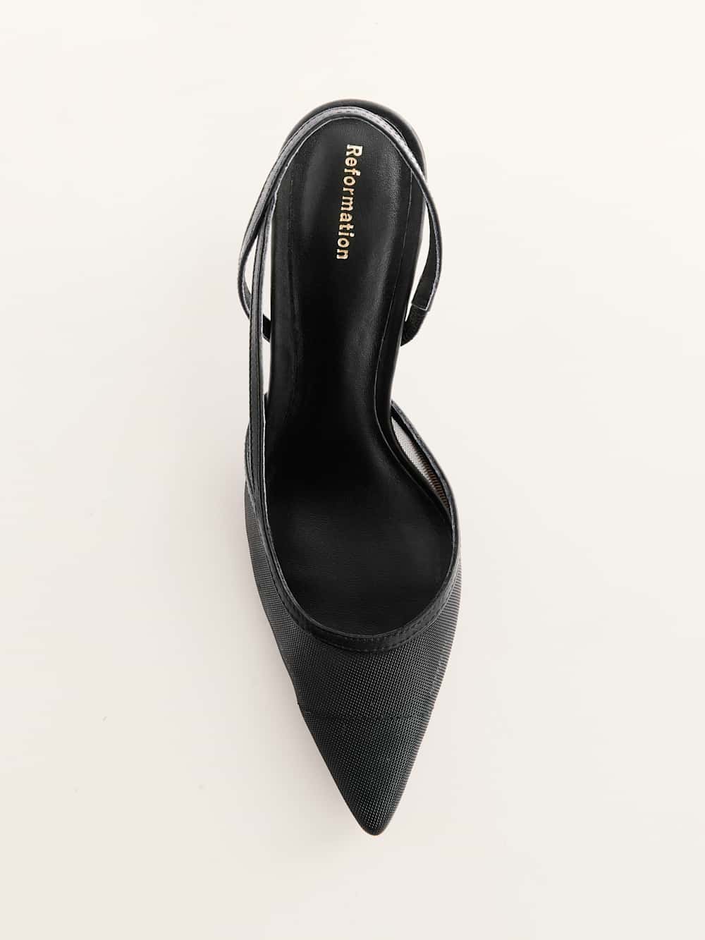 Get to the point. Shop the Whitnee Slingback Heel from Reformation, a pointy, closed toe, slingback heel with a mesh upper and skinny heel.